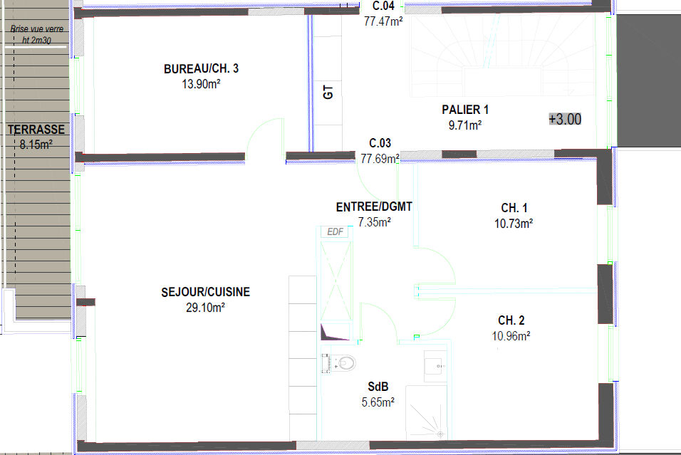 Cet appartement T4 fait 77.69m² et possède une terrasse de 8,15m².