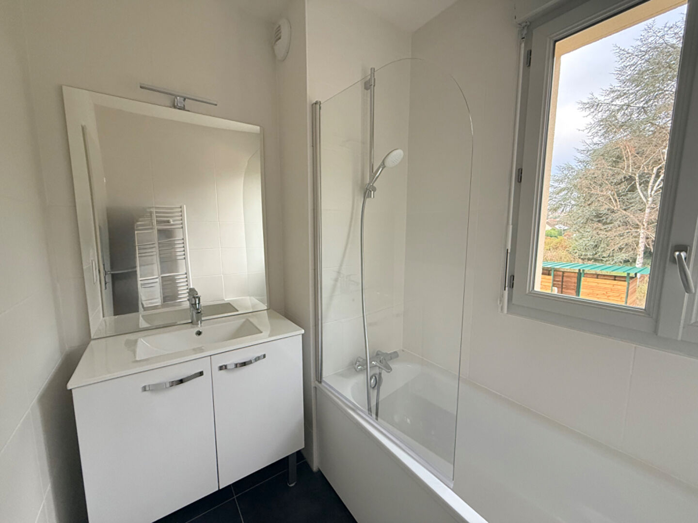 ? Salles de bains, et salles d'eau à l'étage, équipées de meuble vasque avec une applique lumineuse au dessus du miroir et d'un radiateur sèche-serviette électrique.