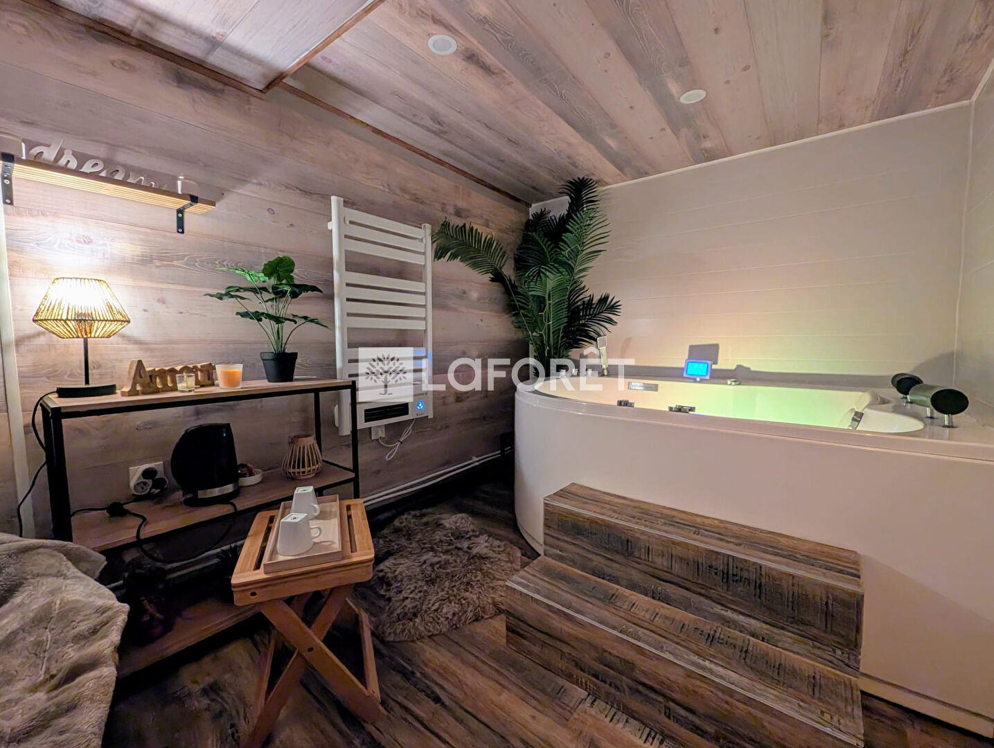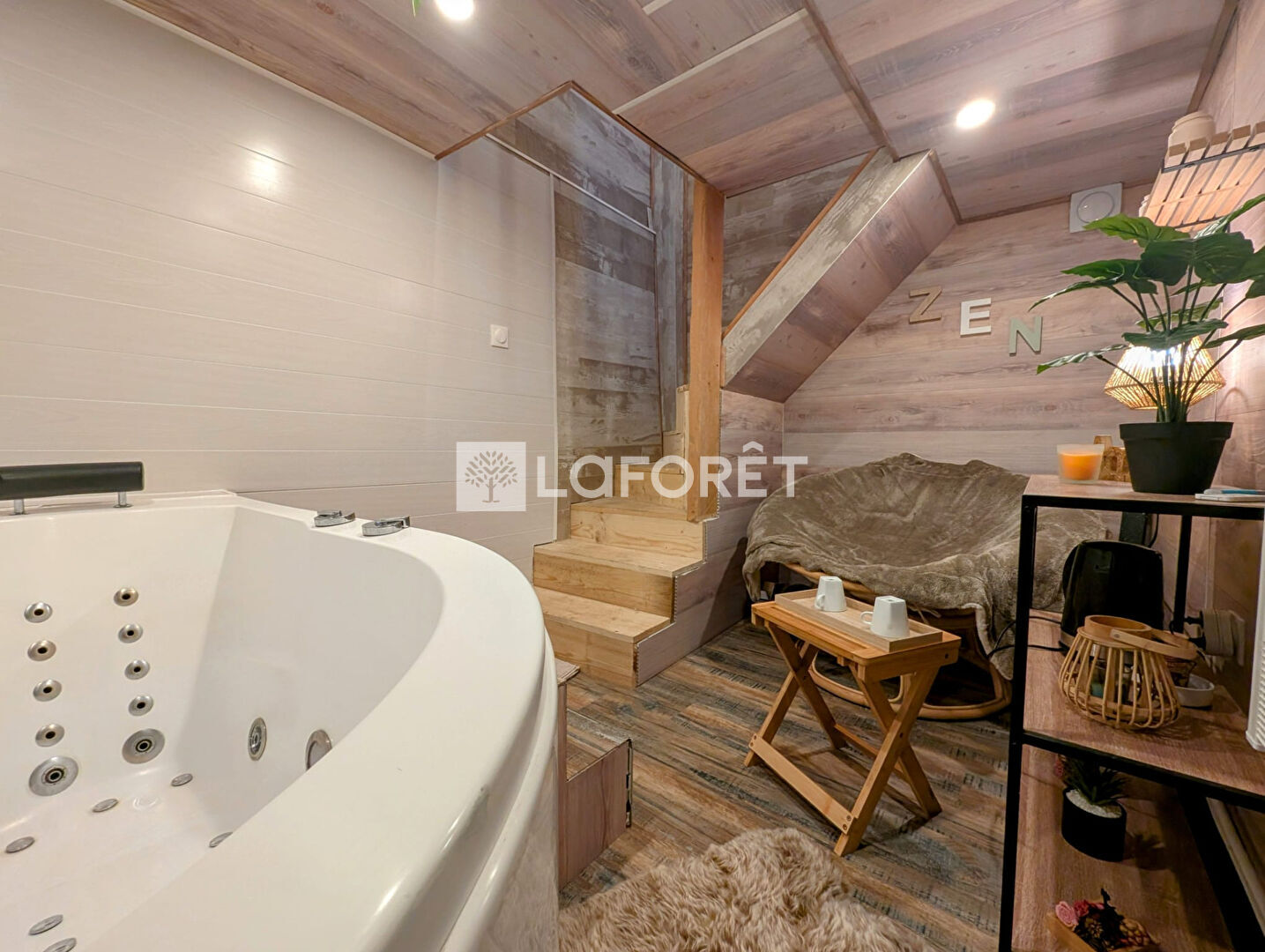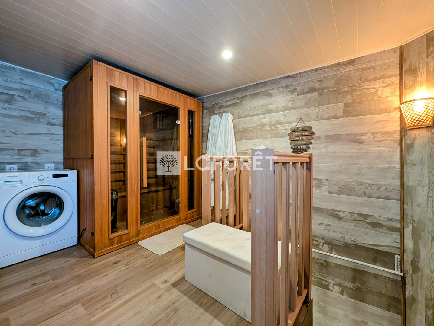 Au rez-de-chaussée (en semi-étage) : entrée, pièce à vivre avec poêle à granulés, cuisine ouverte, ainsi qu'un dressing. Vous aurez également accès à un sauna et une baignoire balnéo.