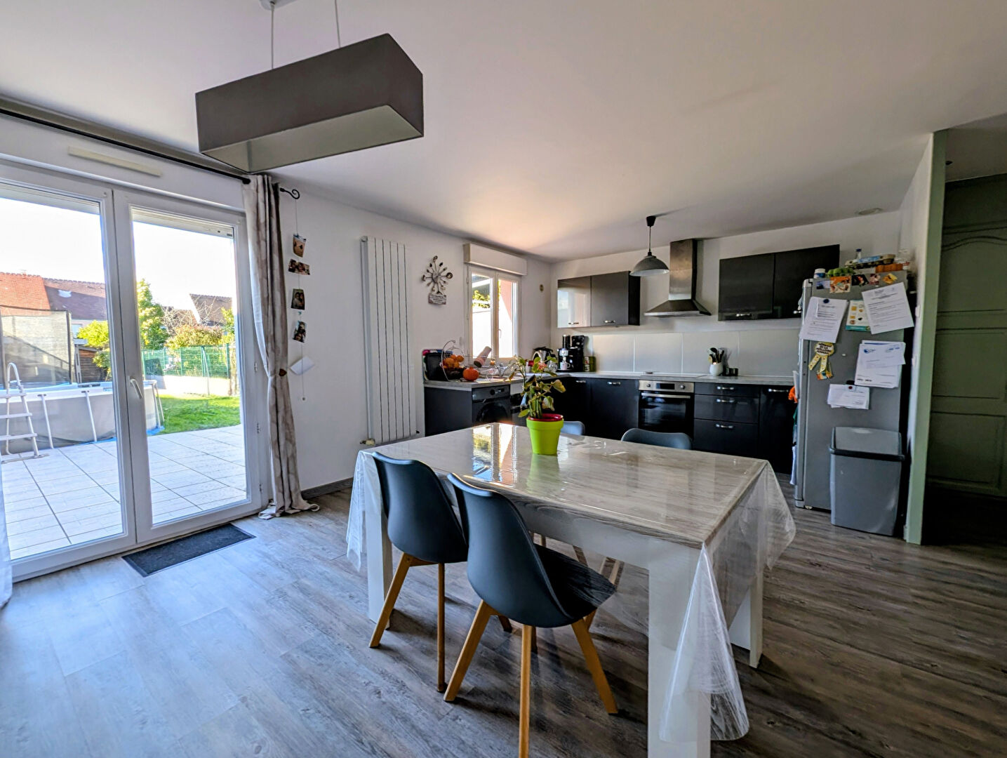 Au rez-de-chaussée, entrée avec rangements, pièce à vivre d'environ 50 m² avec cuisine ouverte, WC et accès au garage.