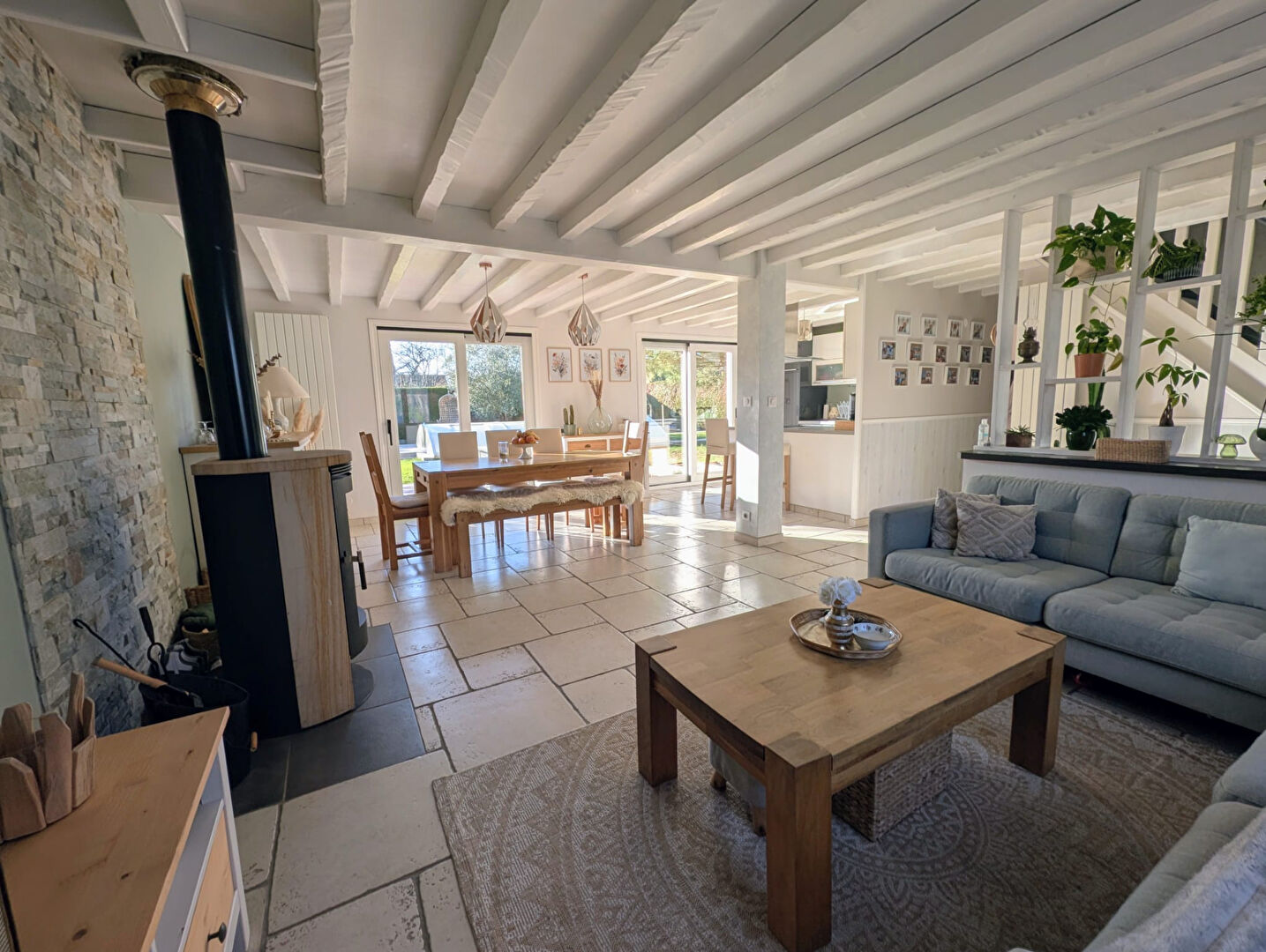 Au rez-de-chaussée : entrée, pièce à vivre avec poêle à bois, cuisine ouverte équipée, couloir, chambre, bureau, salle de bains et WC.