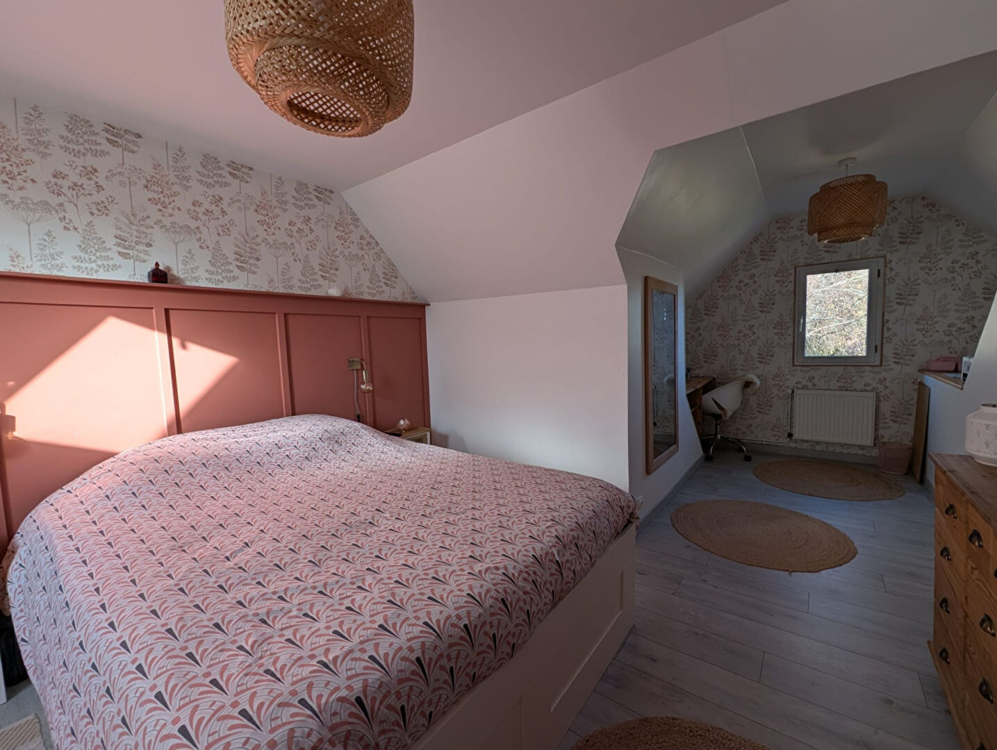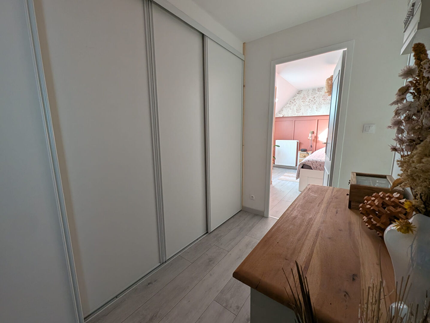 À l'étage : palier avec rangement, deux chambres, salle d'eau.