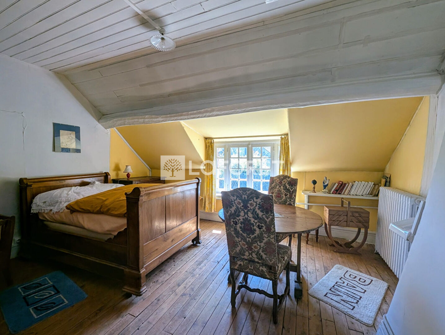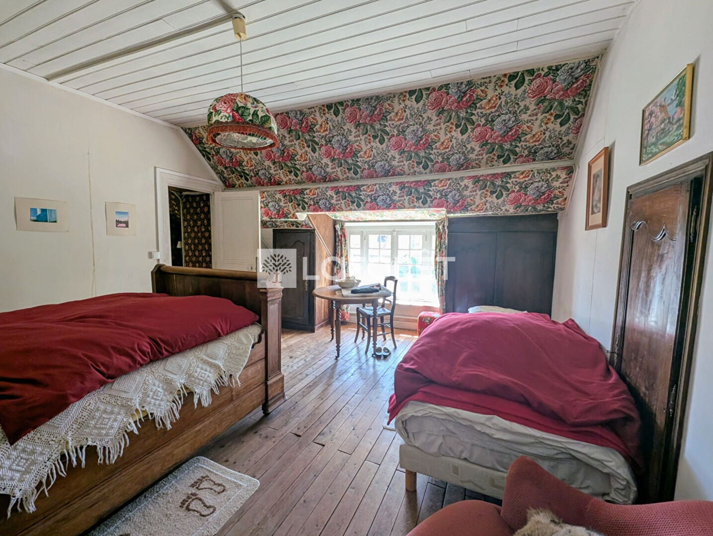 À l'étage, vous disposerez d'un côté de la maison : une chambre donnant accès à un couloir desservant une salle de bains, WC séparés et un vaste dortoir disposant d'une cheminée et d'un balcon.