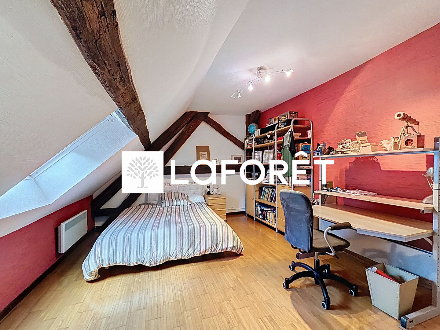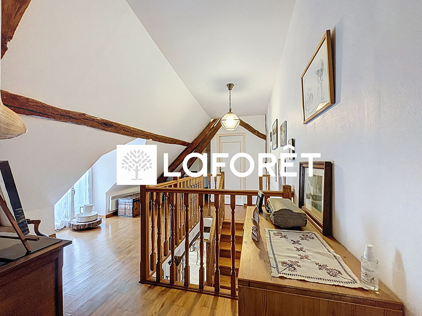 À l'étage, un grand palier avec rangements distribue trois grandes chambres, une salle de bains et un WC indépendant.
