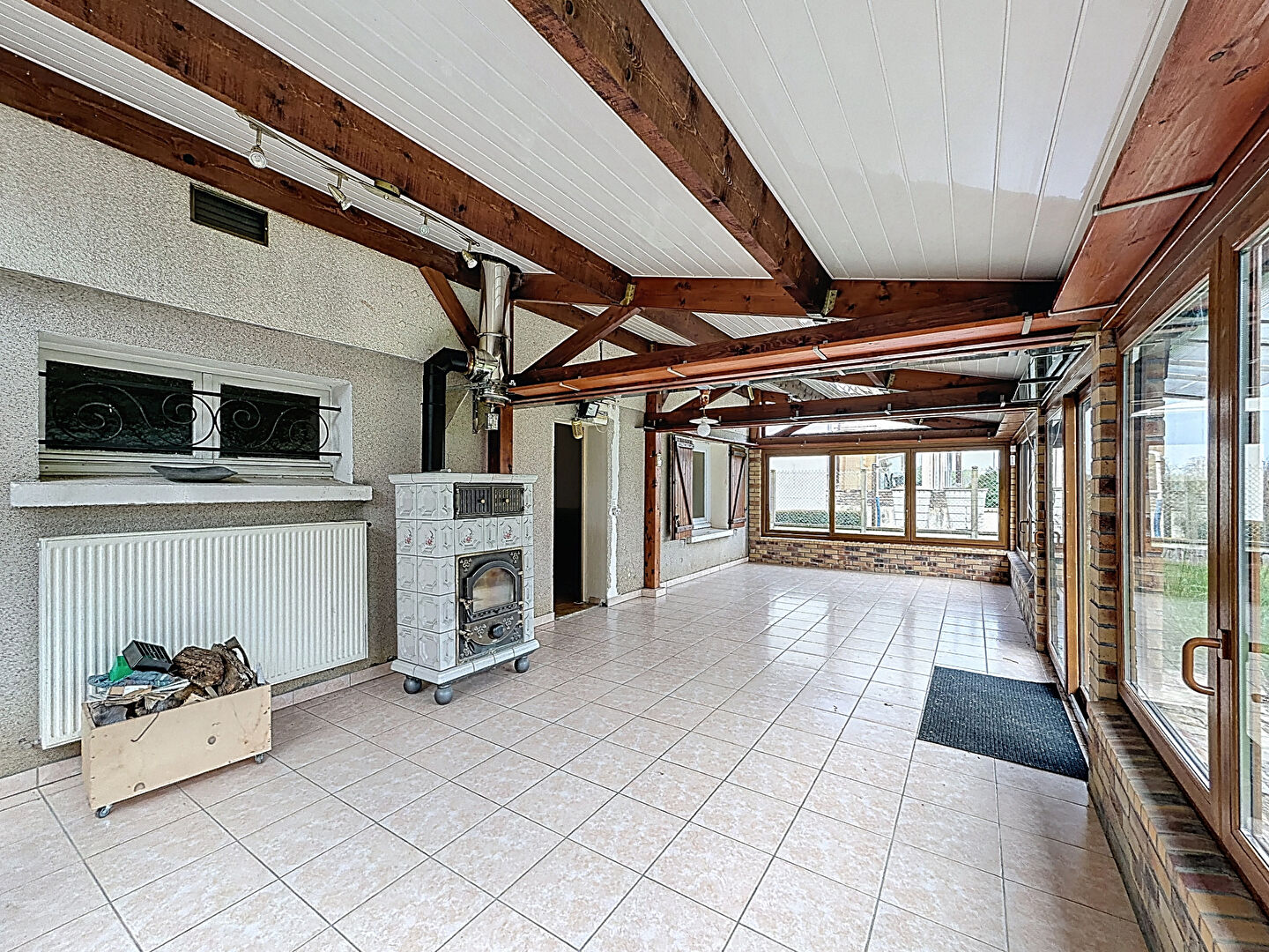 Vous bénéficierez également, depuis cet espace, d'un accès à une magnifique véranda de 34 m², chauffée par un poêle à bois en porcelaine.