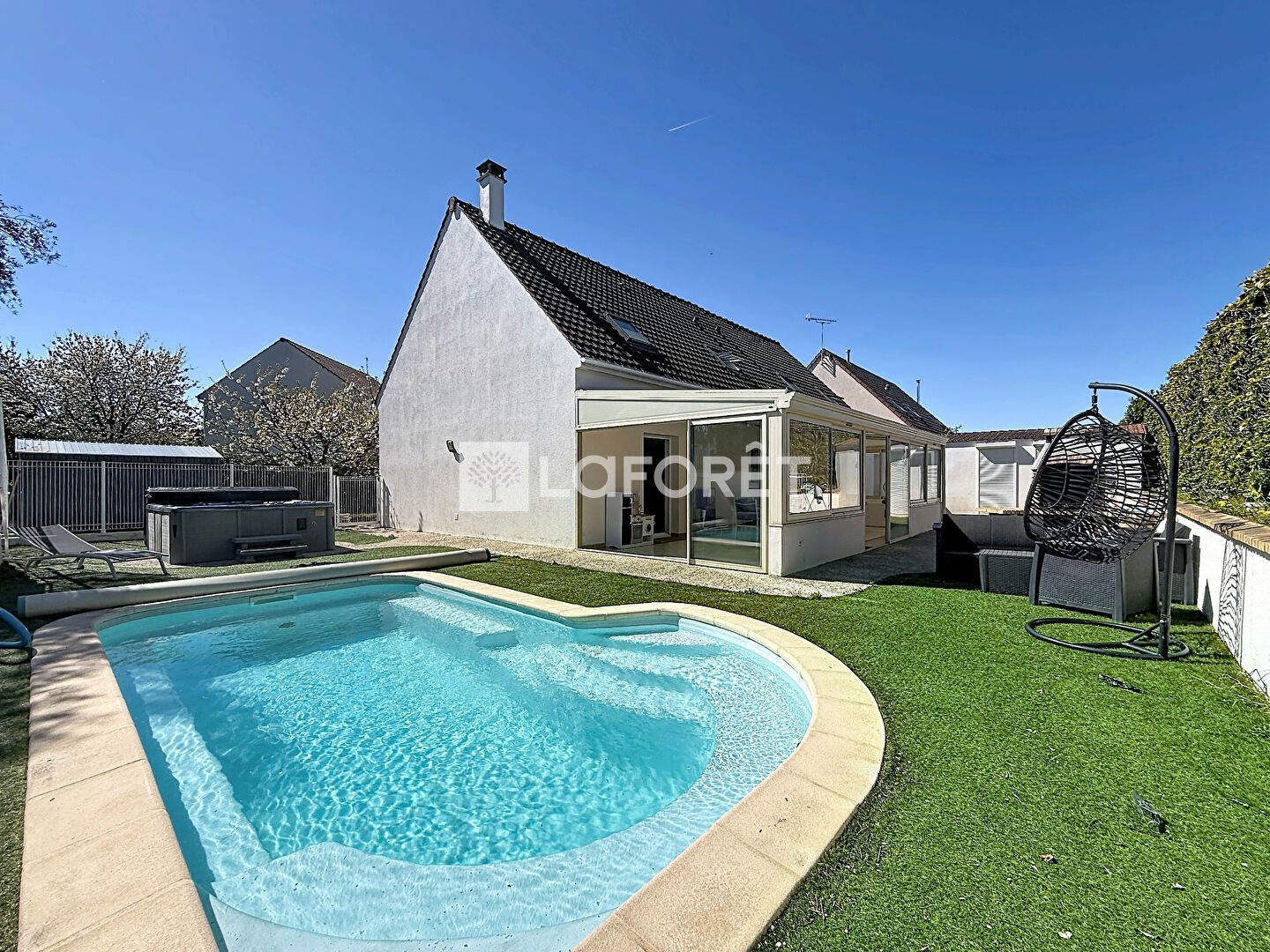 À l'extérieur, tout est réuni pour profiter pleinement des beaux jours : piscine chauffée, jacuzzi, terrain de pétanque, barbecue et four à pizza, le tout sur un terrain de 691 m².