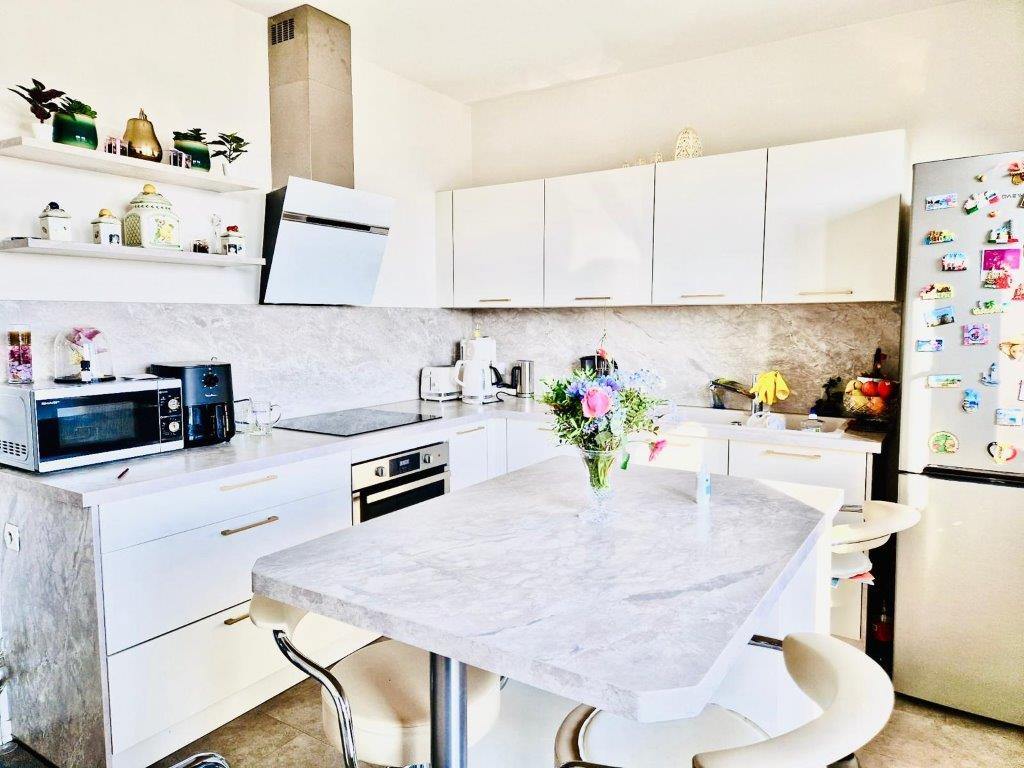il y a deux chambres a coucher dont une avec accès a un balcon , une salle de bain avec douche a l italienne et meuble une vasque, une cuisine entièrement équipée avec ilot central et accès sur un balcon, un wc séparé, nombreux placards , un séjour spacieux avec accès a un balcon avec une vue a couper le souffle