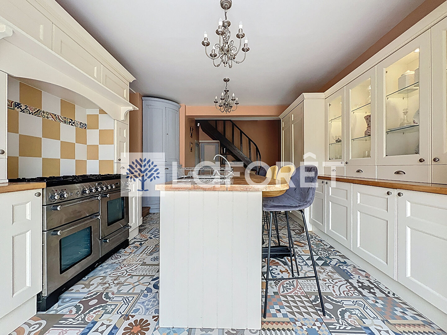 Les pièces de vie se distinguent par leurs beaux volumes et leur luminosité. Le salon, agrémenté d'un poêle à bois, s'ouvre sur une salle à manger conviviale, parfaite pour recevoir. La cuisine aménagée et équipée, au style authentique et raffiné, est complétée par une arrière-cuisine fonctionnelle, offrant un espace de vie à la fois pratique et accueillant. Les parquets massifs et la décoration soignée confèrent à l'ensemble une ambiance harmonieuse et élégante.