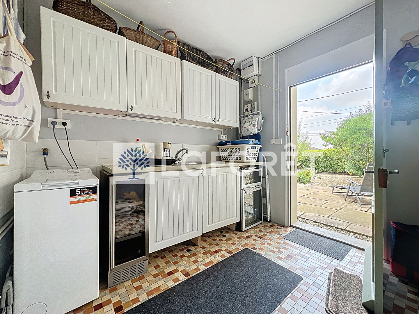 De plain-pied, elle offre une cuisine récente, entièrement aménagée, équipée , une buanderie et un lumineux salon-séjour agrémenté d'un insert, idéal pour les soirées d'hiver.