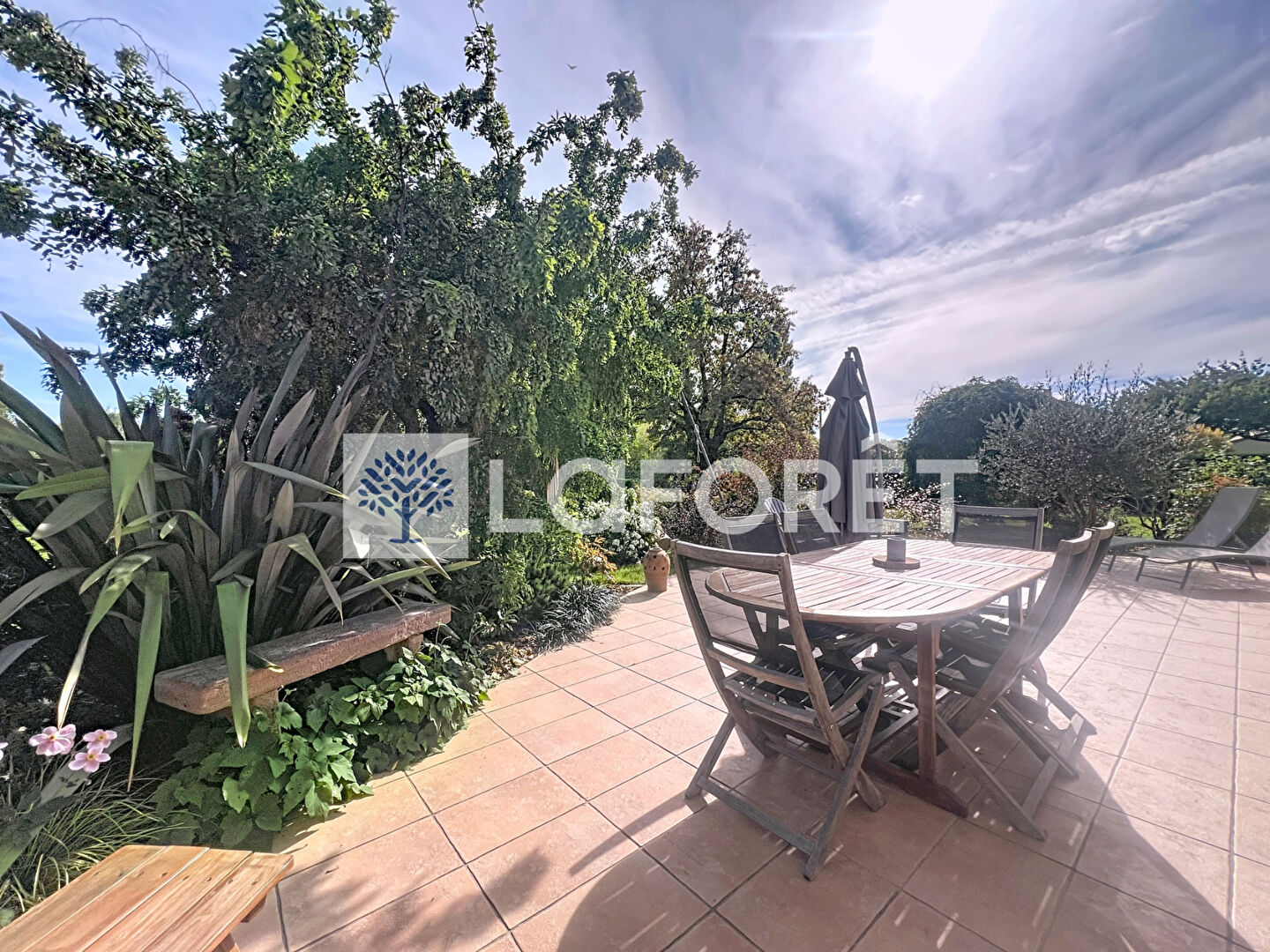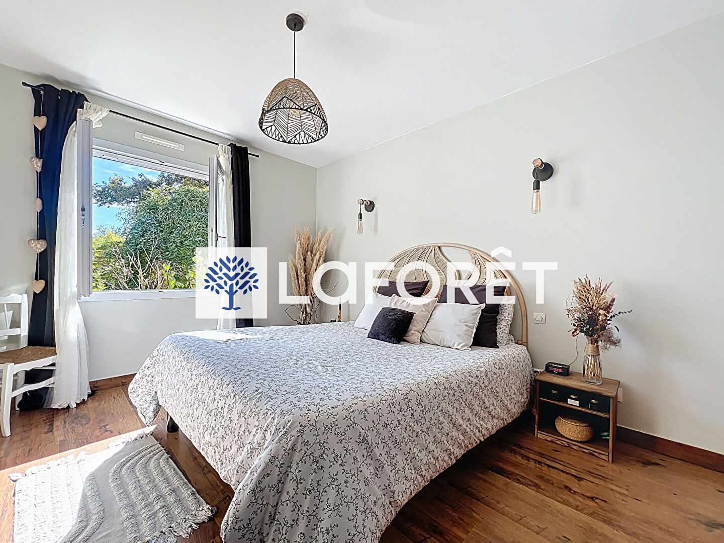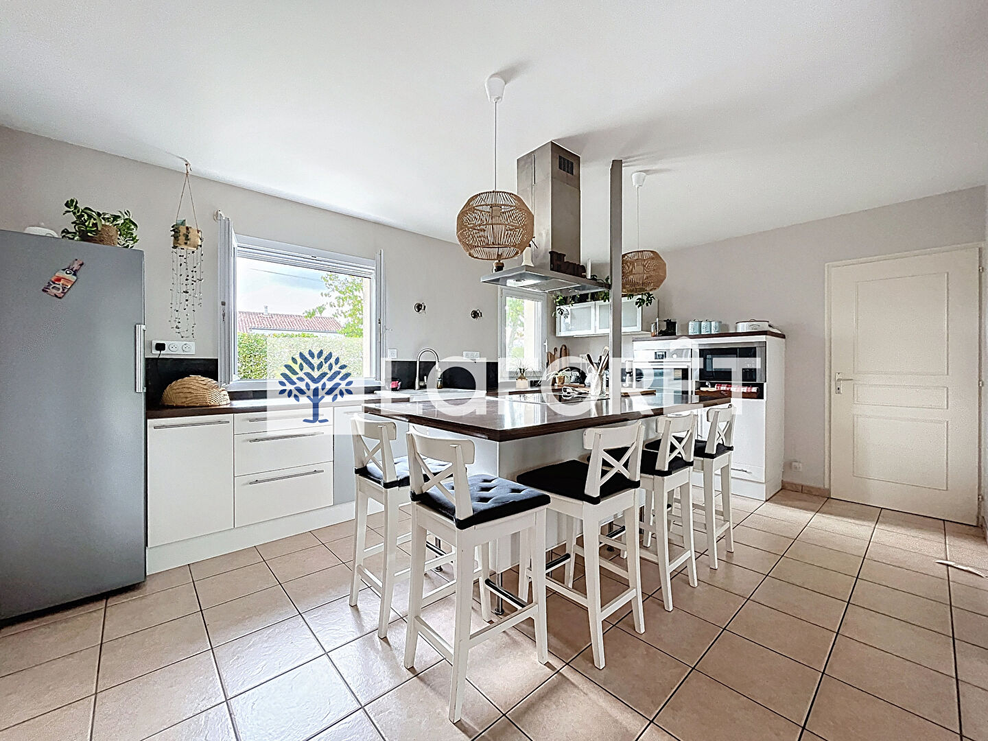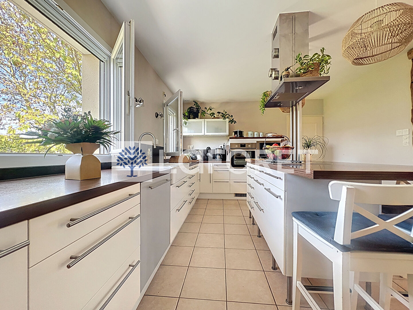 Une grande cuisine moderne, design et entièrement équipée s'ouvre sur un salon-séjour convivial baigné de lumière, agrémenté d'un insert bois qui apporte chaleur et charme. Cette pièce donne directement sur une belle terrasse sans vis-à-vis offrant une vue dégagée et imprenable.
