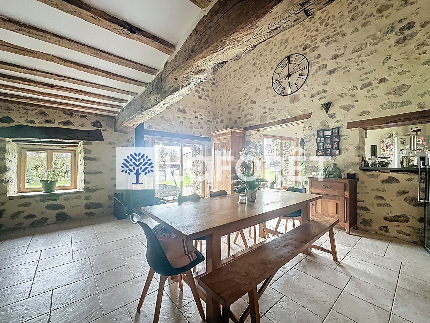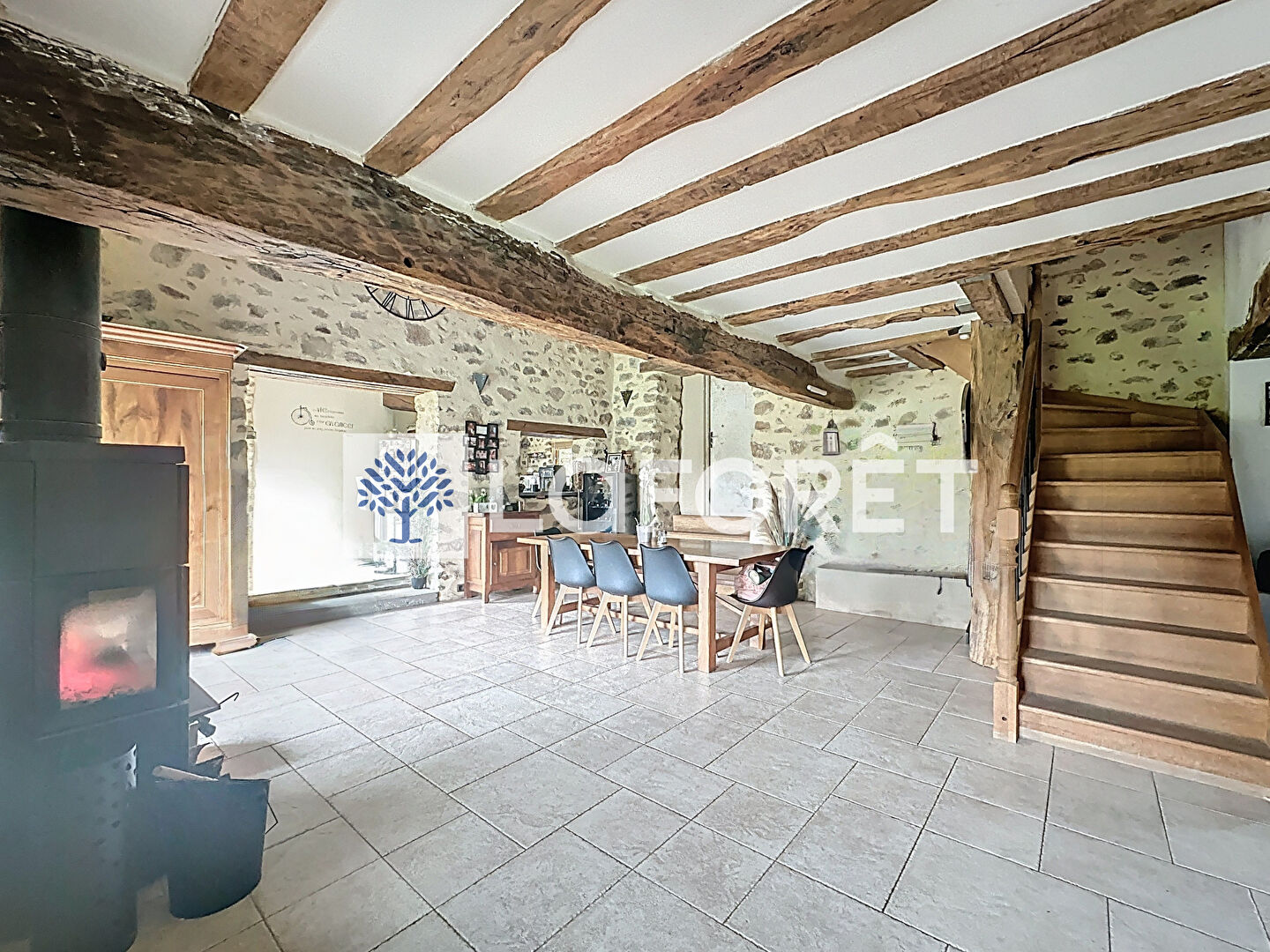 Au rez-de-chaussée, une cuisine semi-ouverte sur un vaste salon-séjour de 62 m² vous accueille, avec un poêle à bois central qui renforce l'ambiance chaleureuse et conviviale, parfaite pour recevoir famille et amis.