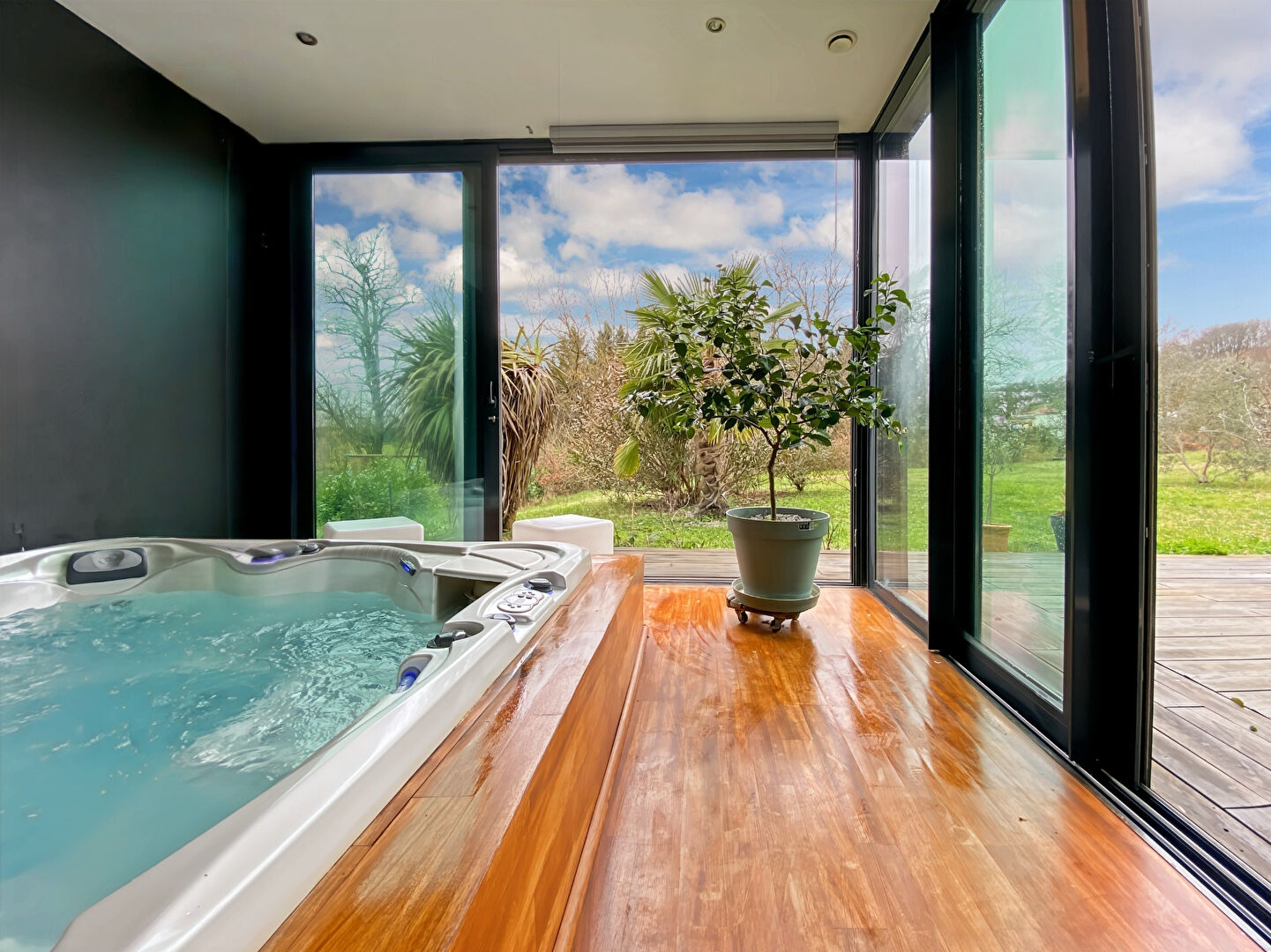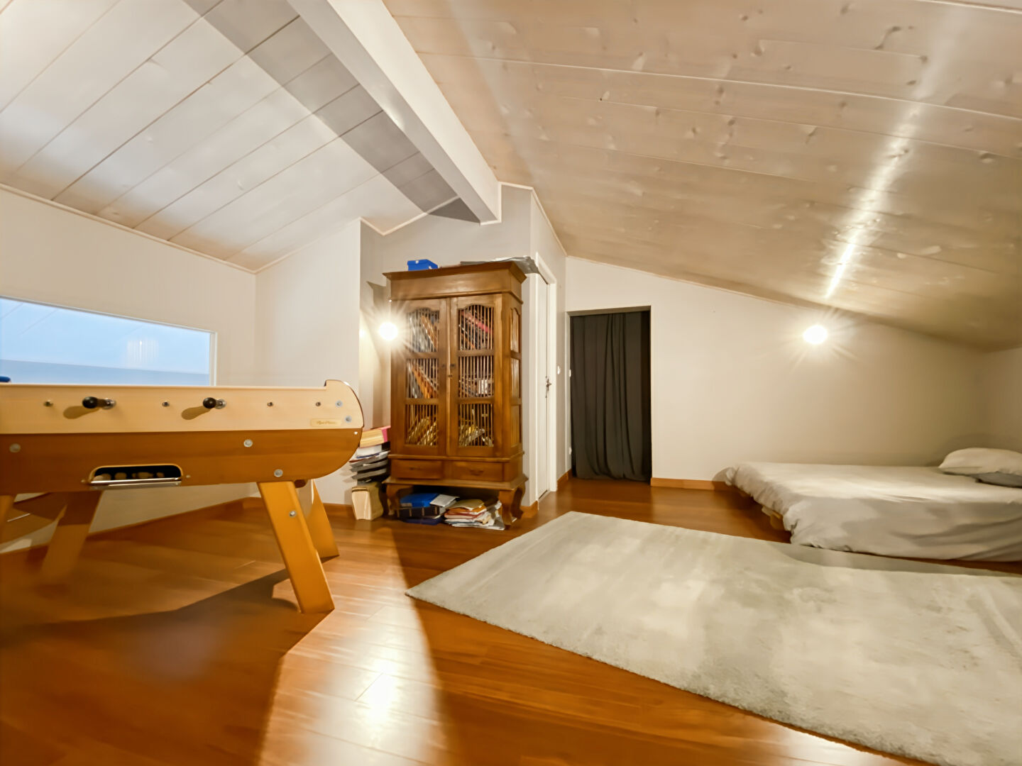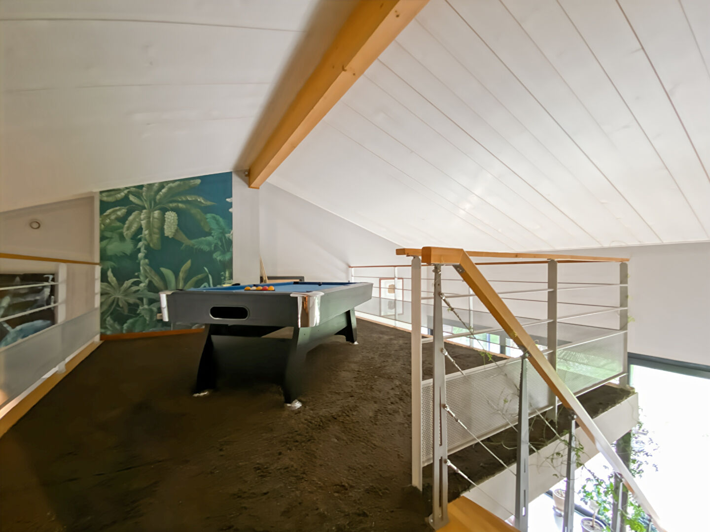 Pour compléter l'ensemble, une mezzanine aménagée en salle de jeux avec billard vient enrichir les volumes, ainsi qu'un espace jacuzzi intérieur pour des instants de détente toute l'année.