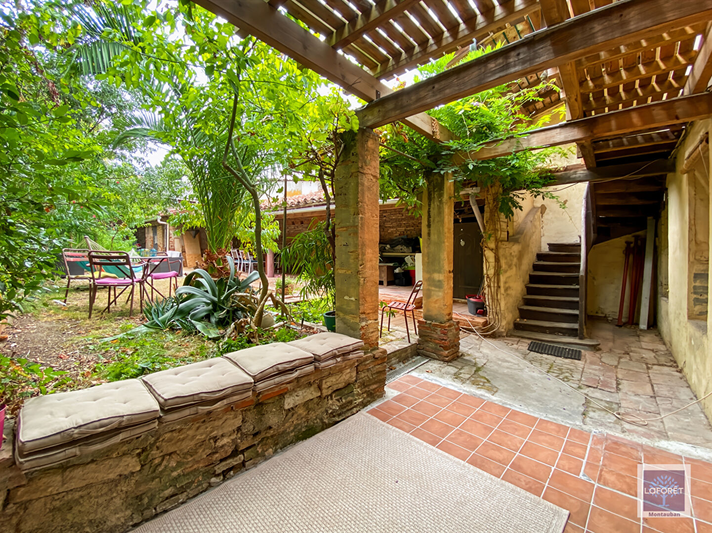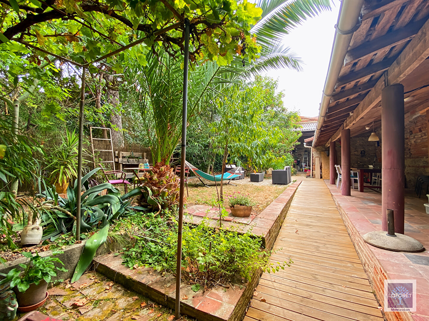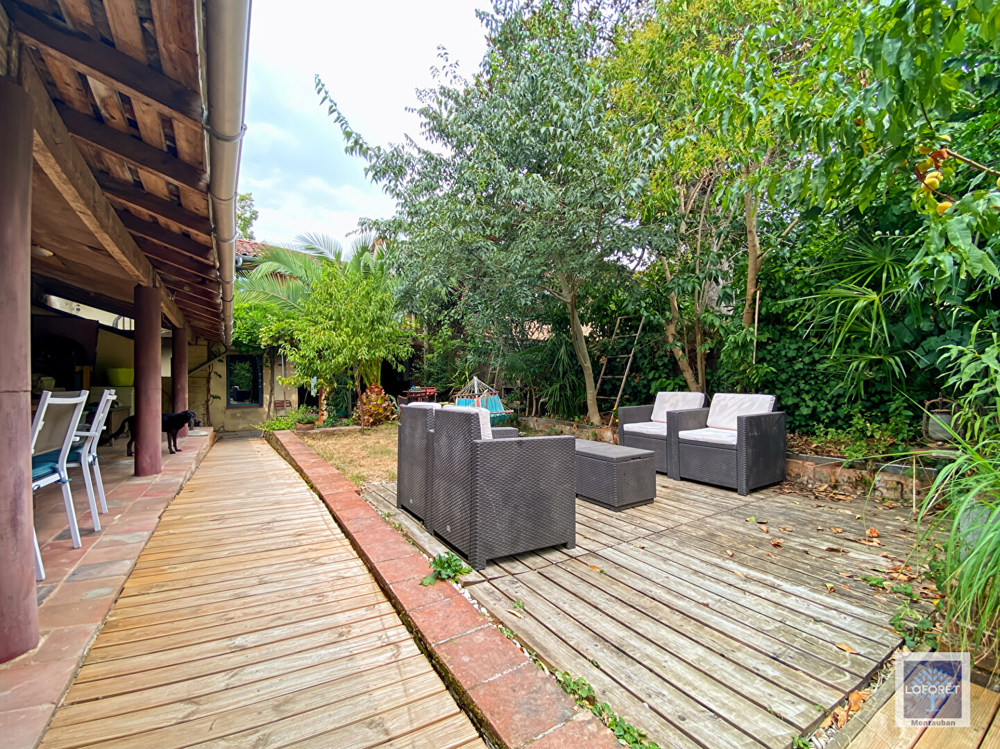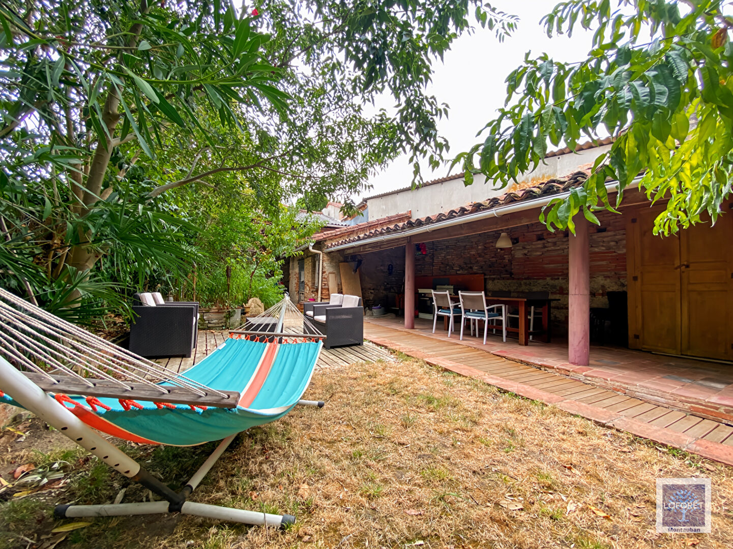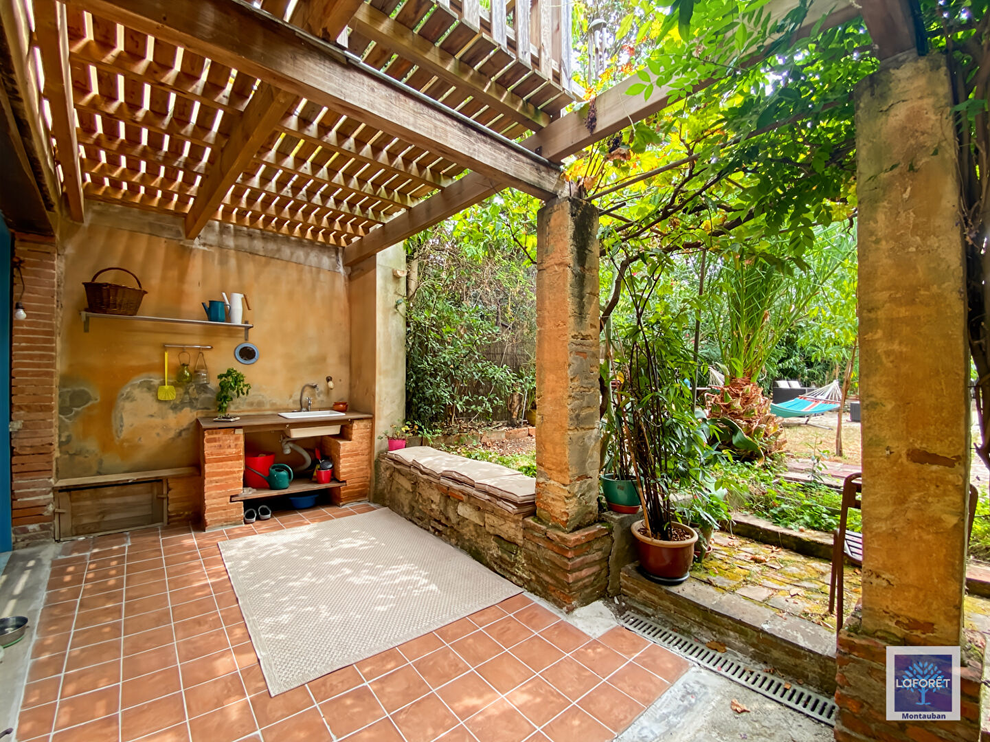 Le jardin très arboré bénéficie d'un charmant préau, d'un atelier et d'une dépendance.