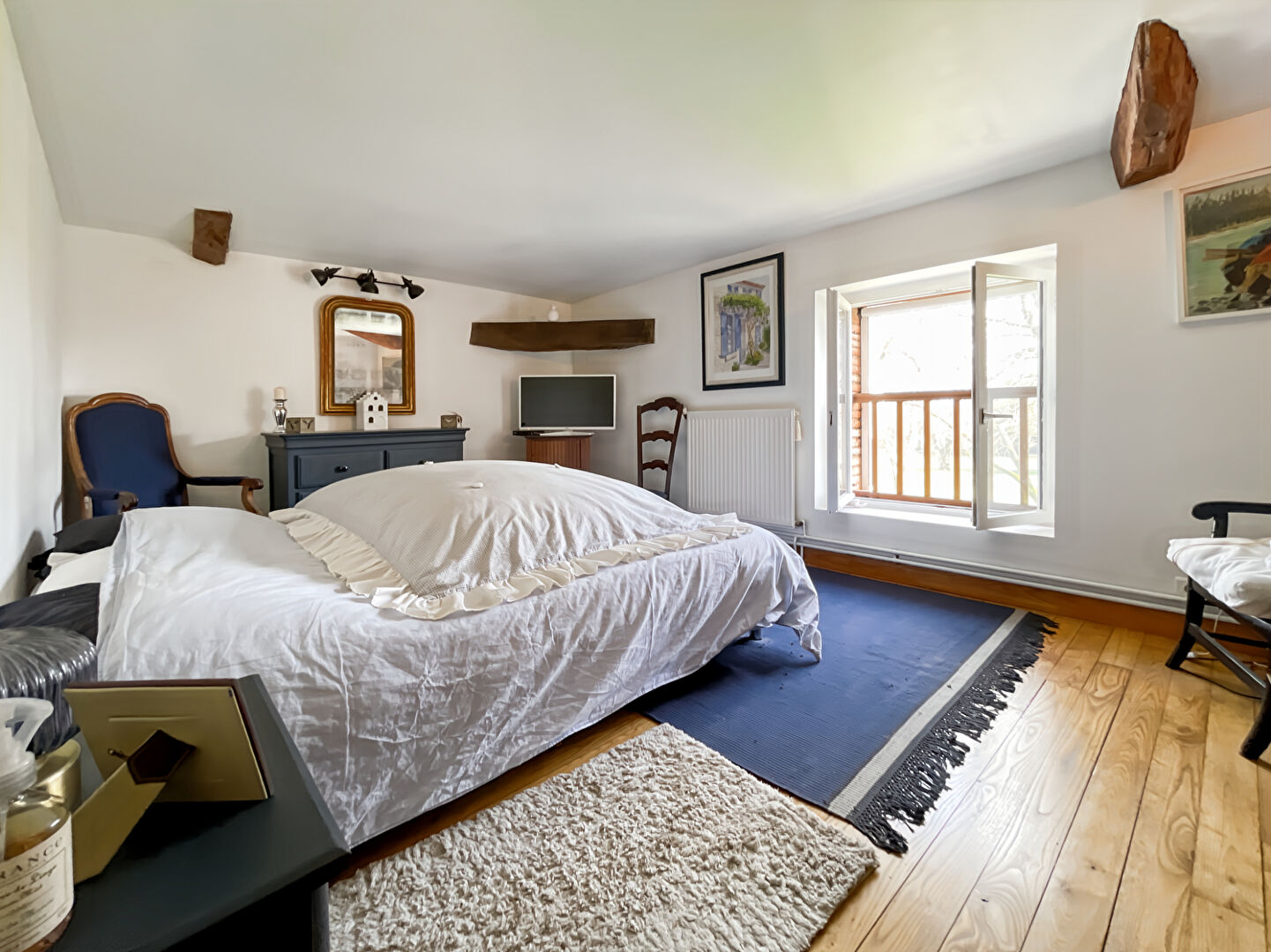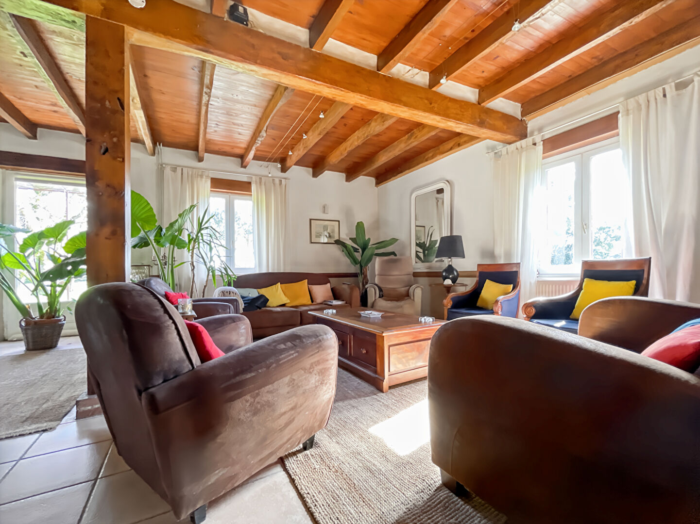 Le salon, véritable cocon, séduit par son atmosphère cosy, ses poutres apparentes et sa belle luminosité grâce à de larges ouvertures sur l'extérieur.