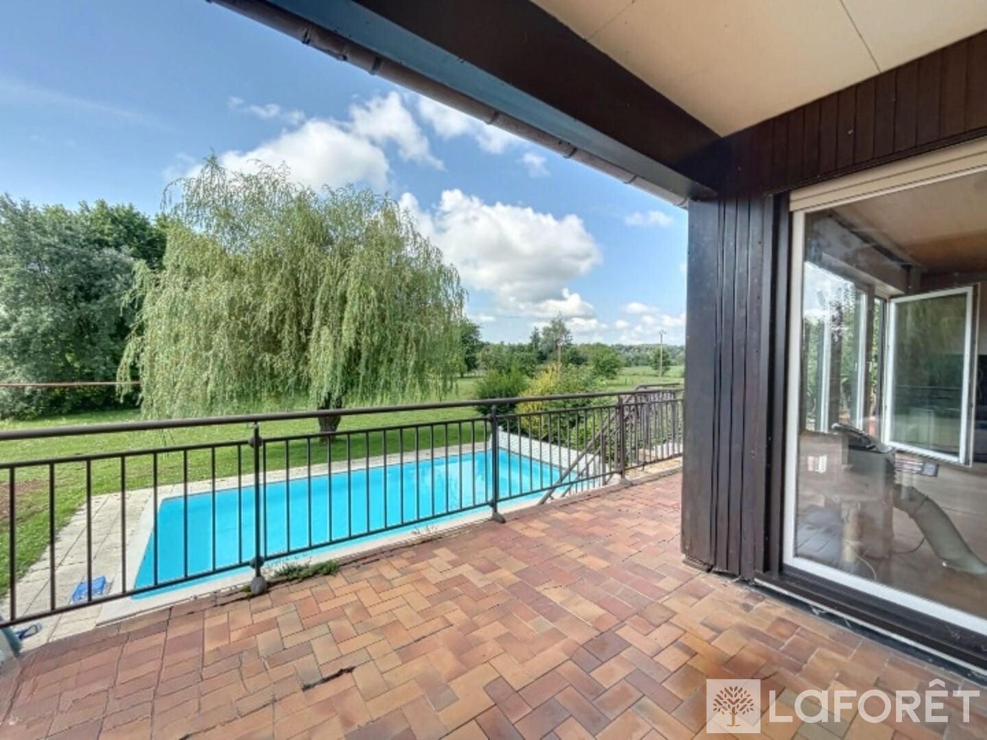 A l'étage, un vaste salon séjour de 30 m² avec balcon et vue sur piscine et jardin, une cuisine indépendante, 4 chambres et une salle de bains avec douche et un WC.