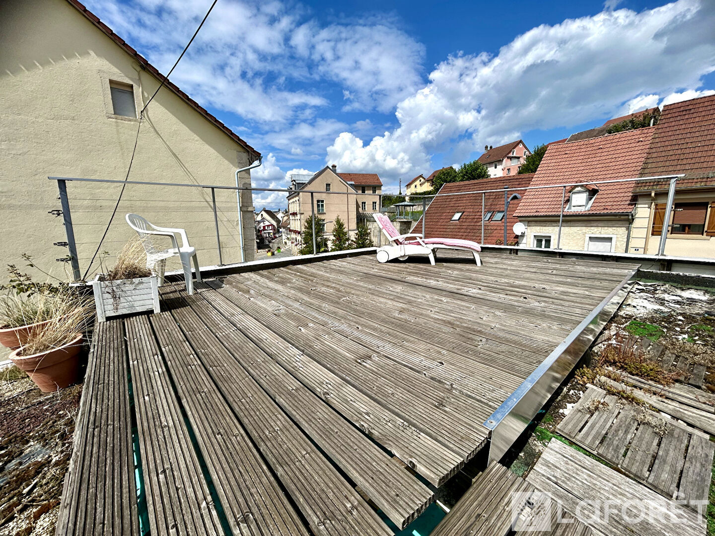 A l'étage, un appartement de 68 m² avec entrée, séjour avec cuisine équipée ouverte, deux chambres, salle d'eau, WC et terrasse de 18 m² avec vue sur le centre ville.