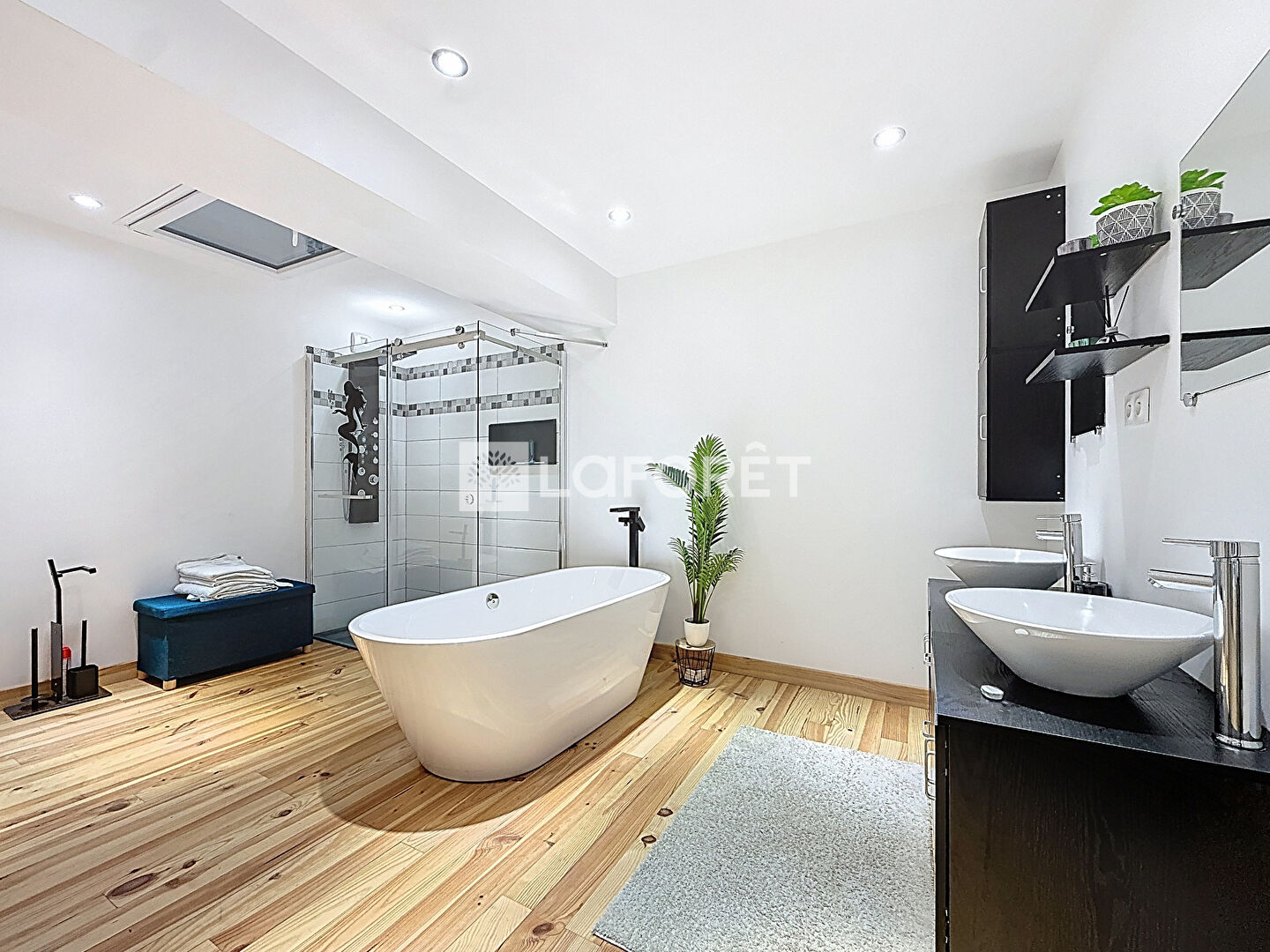 Toujours à l'étage, vous trouverez une seconde salle de bain équipée d'une baignoire, d'une douche, d'une double vasque et d'un WC. Un petit salon d'hiver vient compléter cet étage et offre un espace supplémentaire agréable pour se détendre.