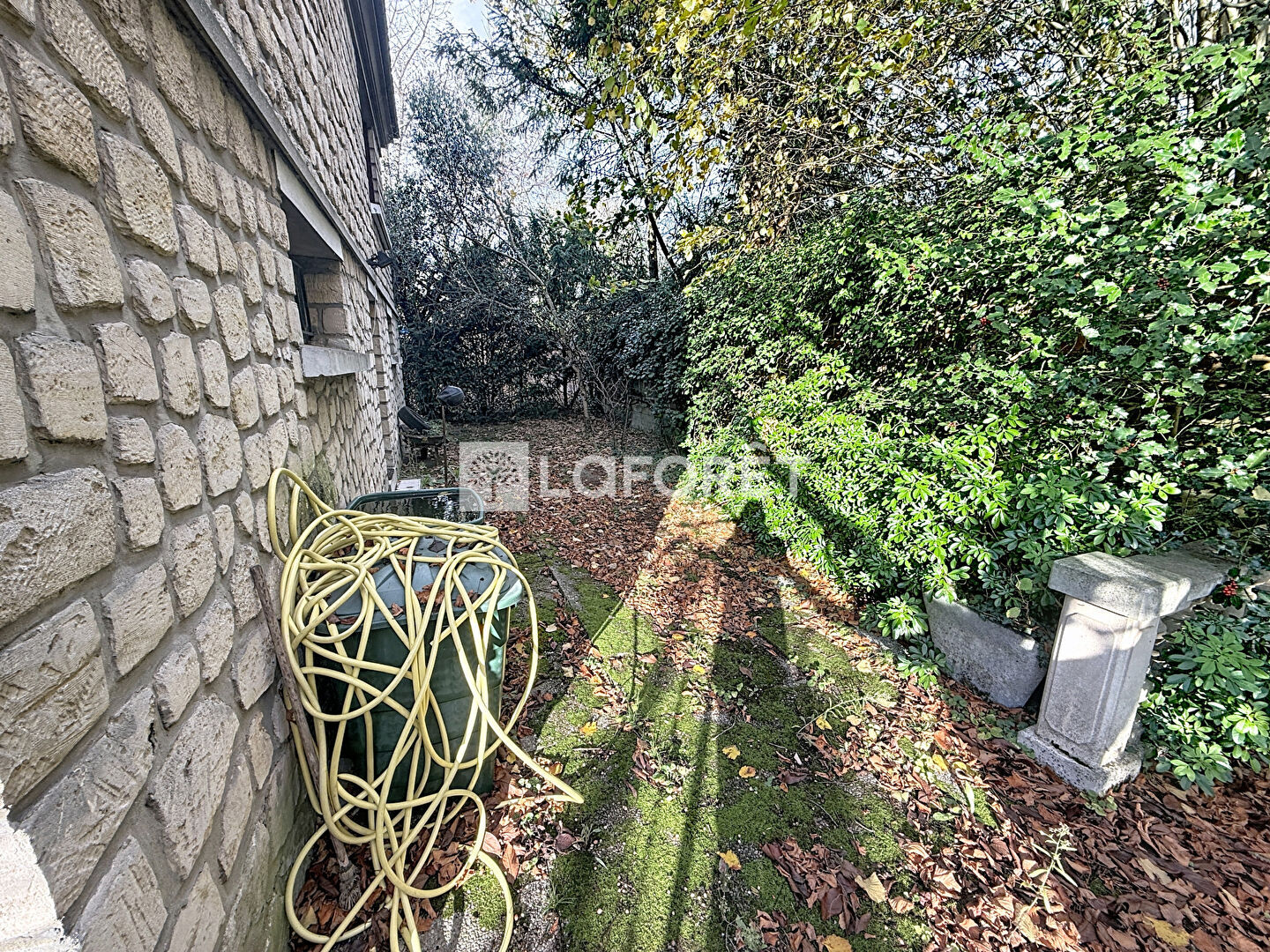 Profitez d'un terrain de 438 m² offrant une terrasse ensoleillée pour les repas d'été et un jardin où les enfants pourront jouer et les adultes se détendre. L'ensemble est mis en valeur par une façade en pierre naturelle et un escalier avec rambardes en pierre, conférant un charme authentique et intemporel.