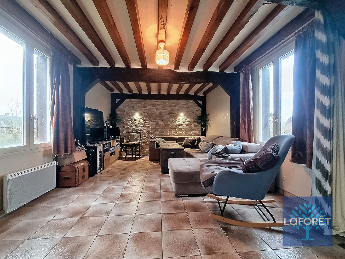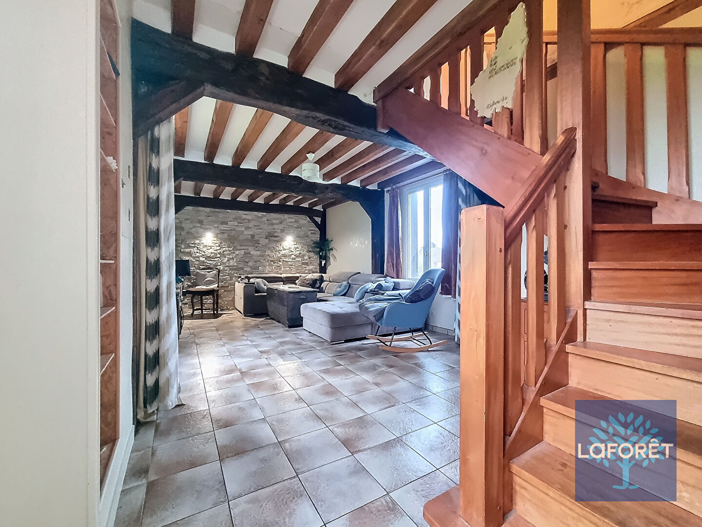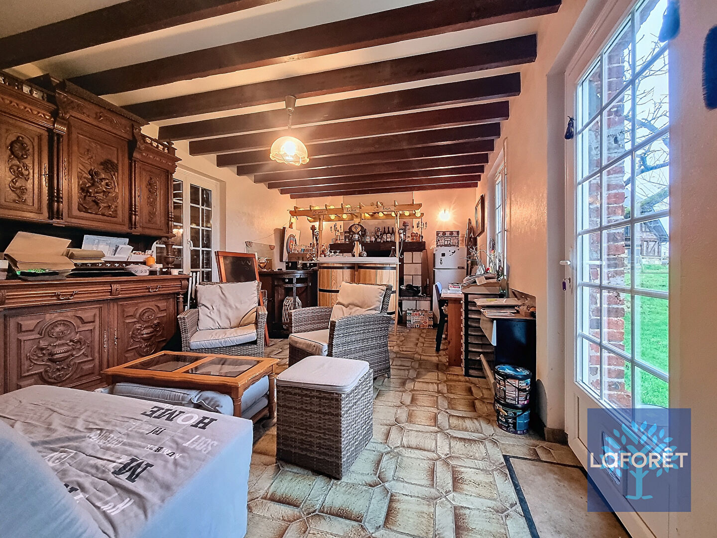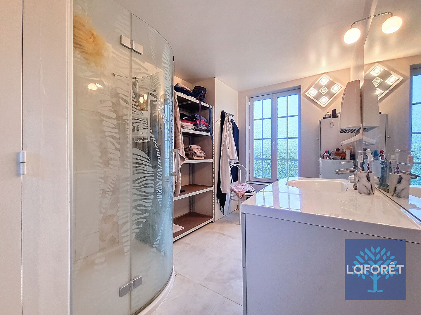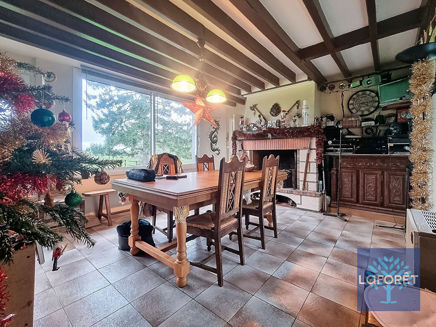 Au rez-de-chaussée, une salle à manger avec cheminée, une cuisine aménagée, une grande pièce de vie, un salon, une arrière cuisine, une buanderie, et un wc.