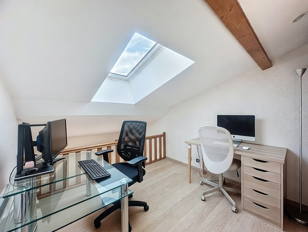 À l'étage, un dégagement dessert deux chambres supplémentaires, chacune avec son dressing attenant, ainsi qu'une seconde salle de bains avec WC, offrant un espace nuit bien distinct pour les enfants ou les invités. Grâce à ses surfaces généreuses (120 m² Carrez, 144 m² au sol) et son exposition sud-est, le duplex est lumineux tout au long de la journée et se prête facilement à différents aménagements selon vos projets de vie.