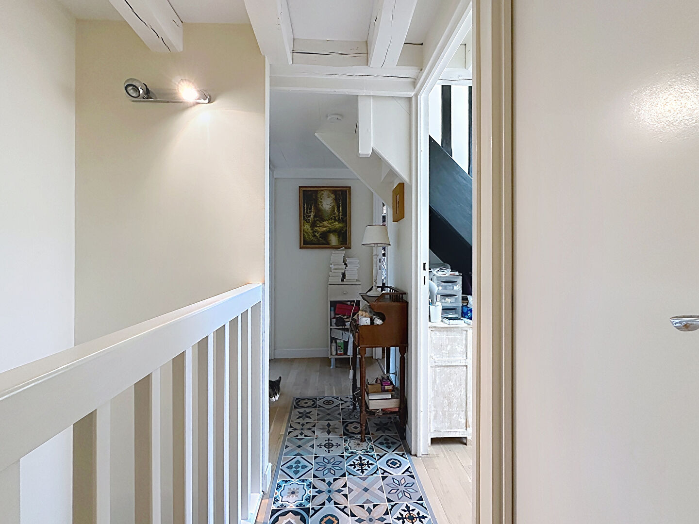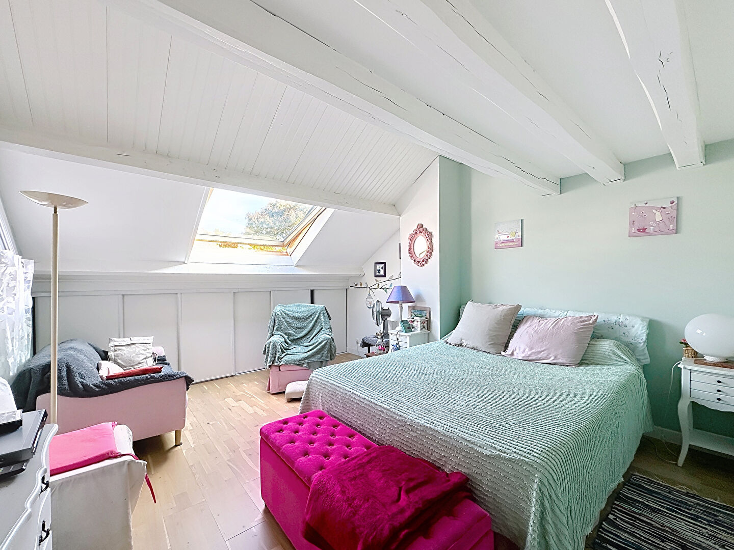 A l'étage, vous trouverez trois chambres confortables, une salle-de-bains avec baignoire balnéo, un WC et de nombreux rangements sous rampants optimisant la place disponible de cet étage.