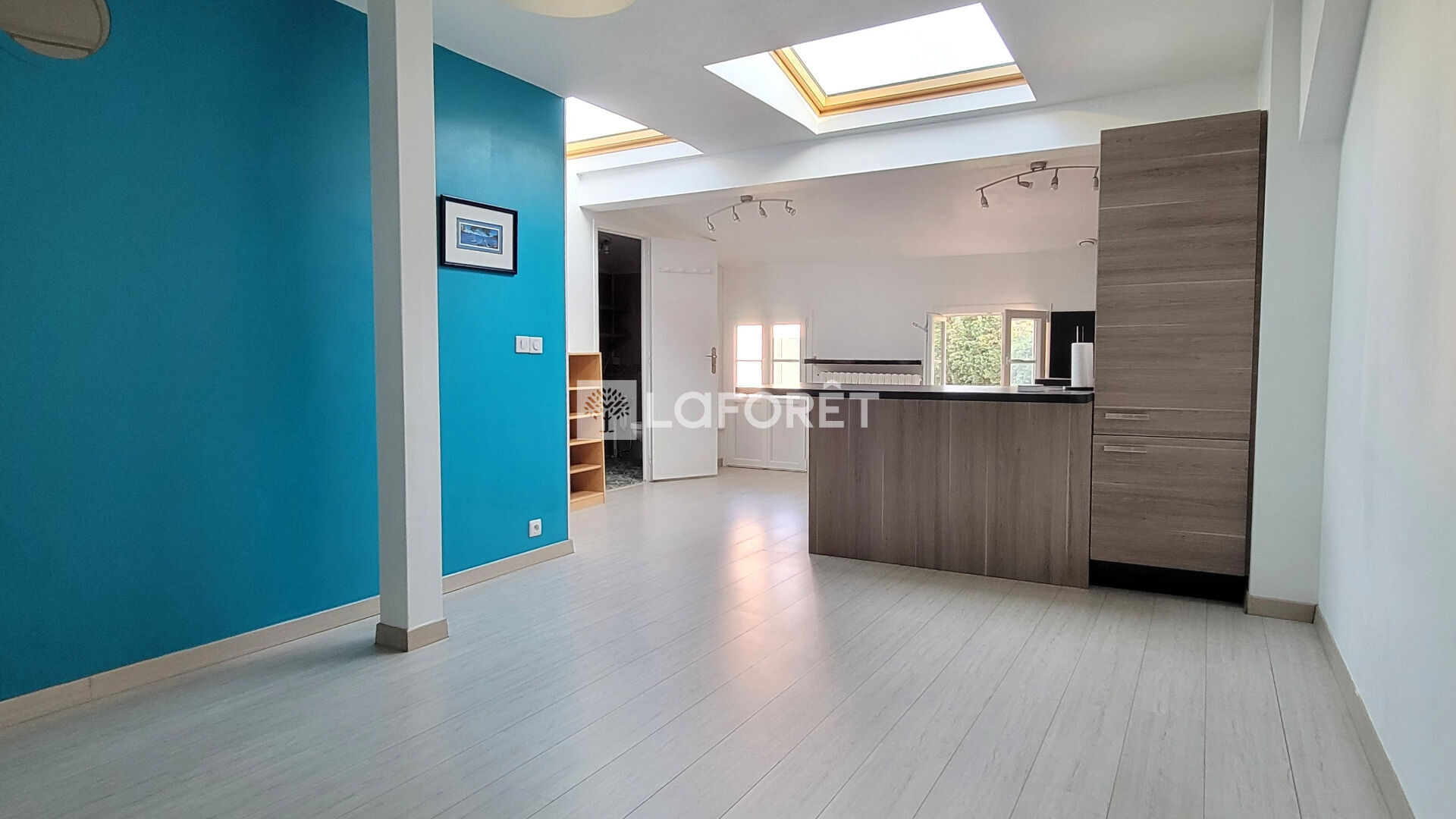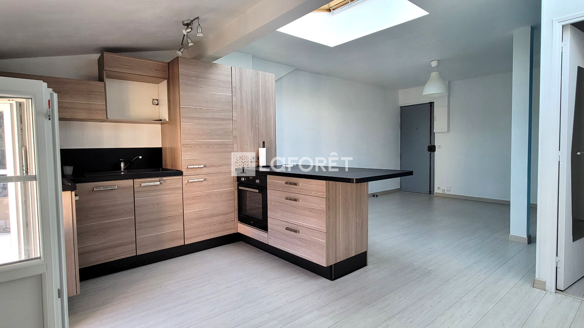 Dès l'entrée, la pièce de vie s'organise autour d'un séjour avec cuisine ouverte, bénéficiant de larges puits de lumière qui apportent un éclairage naturel direct au coeur de l'espace, tandis qu'un balcon de faible largeur prolonge le séjour vers l'extérieur.