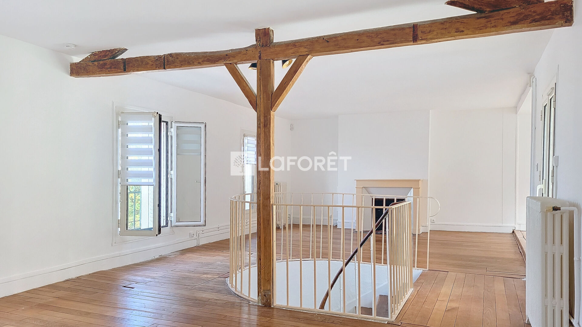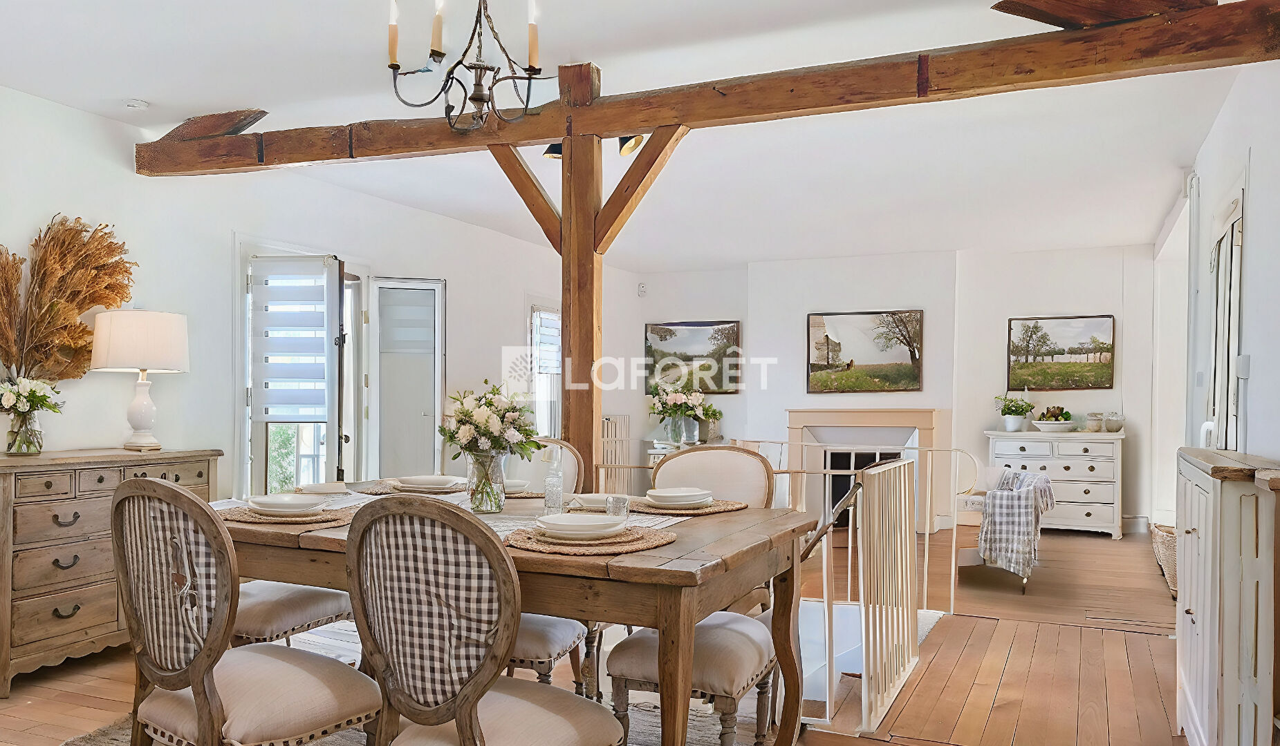 Le niveau principal s'articule autour d'un vaste séjour de plus de 44 m², marqué par une cheminée et une charpente apparente qui structurent l'espace et lui donnent une atmosphère chaleureuse. La cuisine est indépendante, permettant un usage quotidien bien distinct des espaces de réception. Une chambre complète ce niveau, offrant une vraie souplesse d'aménagement selon les besoins.