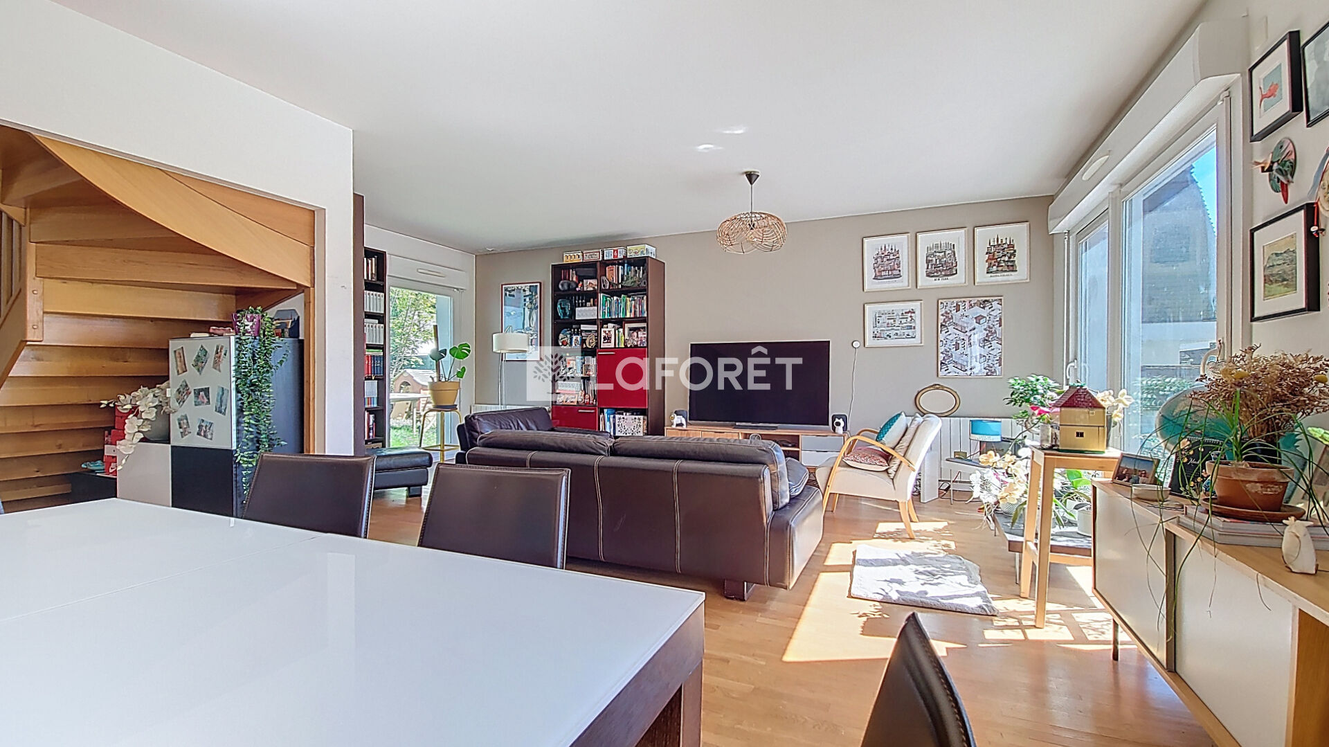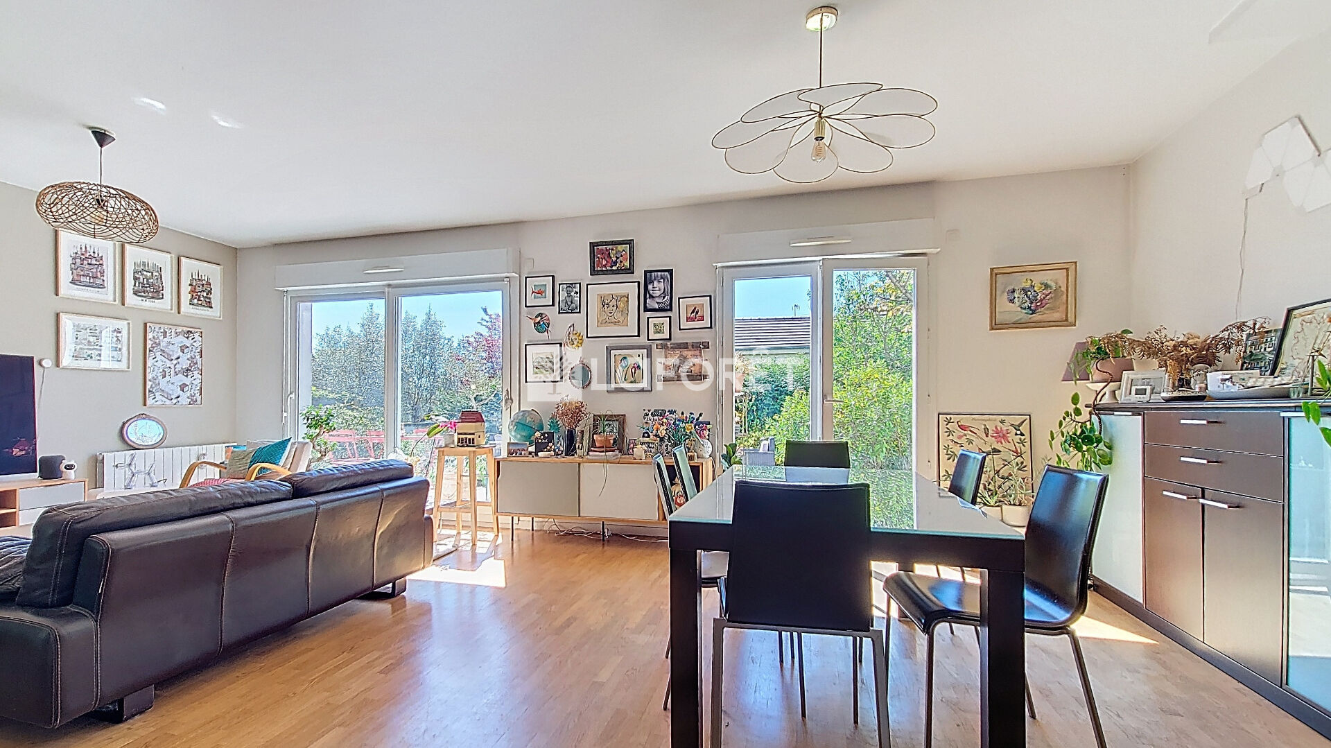 Dès l'entrée, le regard traverse la maison. Le séjour et la salle à manger développent plus de 40 m² en double exposition, ouverts de part et d'autre sur l'extérieur. Deux portes-fenêtres et une baie vitrée coulissante permettent de circuler naturellement vers la terrasse et le jardin. La lumière traverse la pièce de vie tout au long de la journée et la végétation extérieure fait partie de la décoration intérieure.