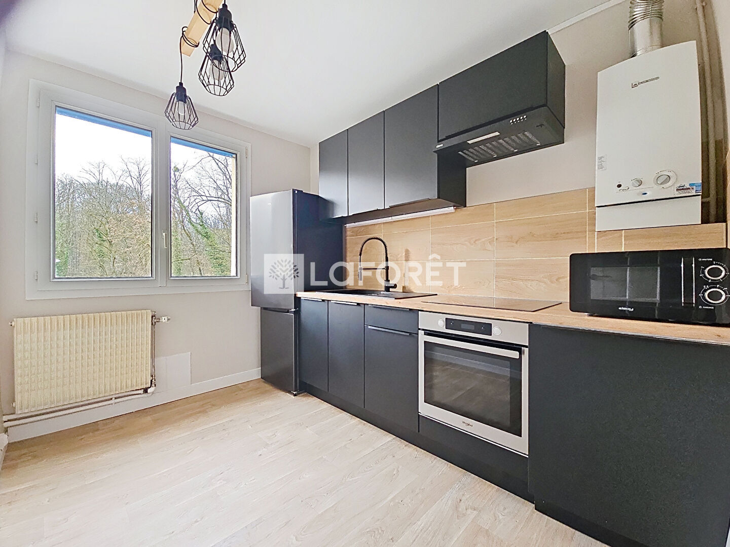 L'entrée avec rangement dessert une pièce de vie lumineuse, éclairée par une baie à trois vantaux dont une porte-fenêtre. La cuisine est indépendante et équipée.