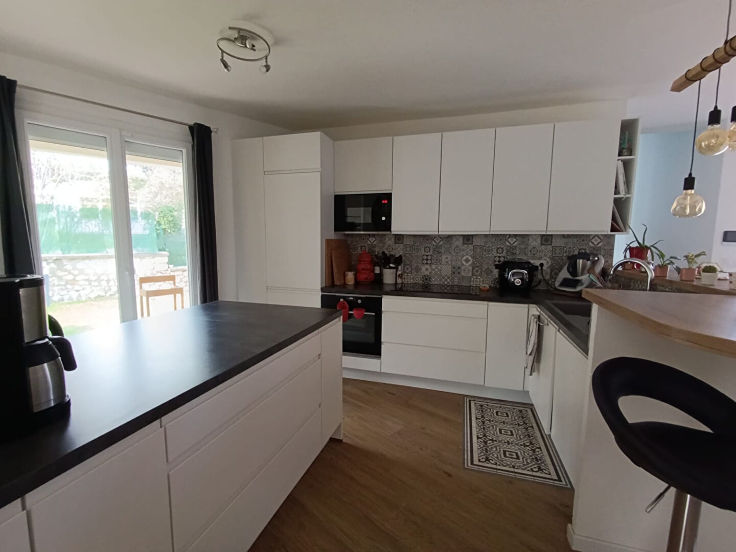 Une spacieuse pièce de vie avec cuisine aménagée entièrement équipée, ouverte sur la terrasse et le jardin avec piscine.