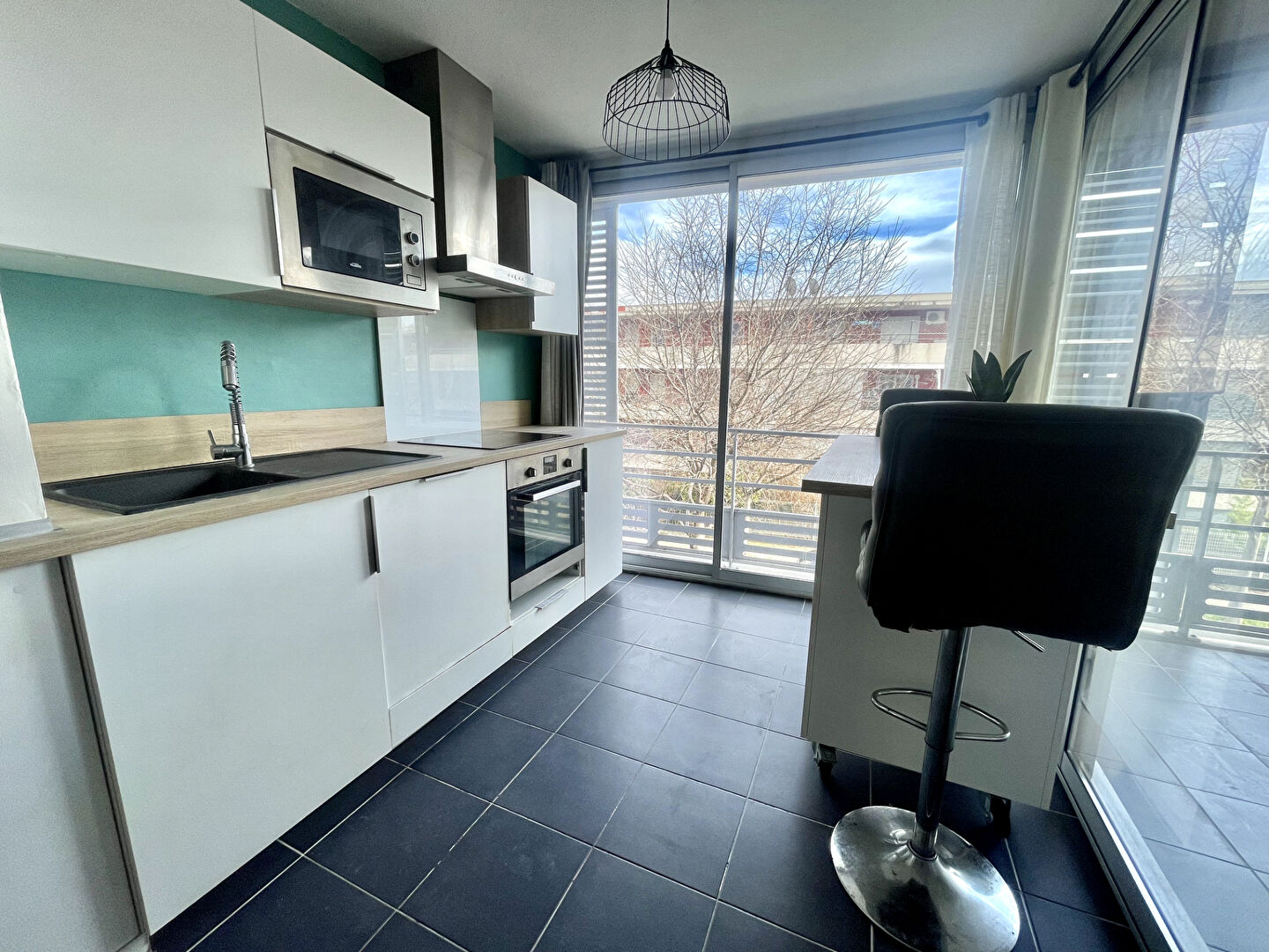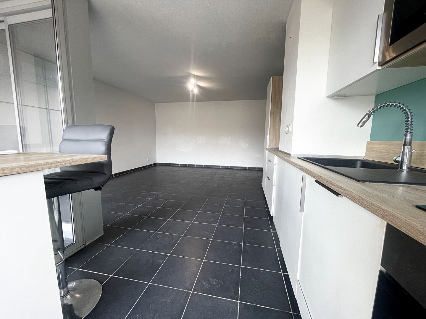 L'espace de vie offre un beau séjour lumineux avec cuisine ouverte, moderne et entièrement équipée, pour une superficie totale de 29 m².