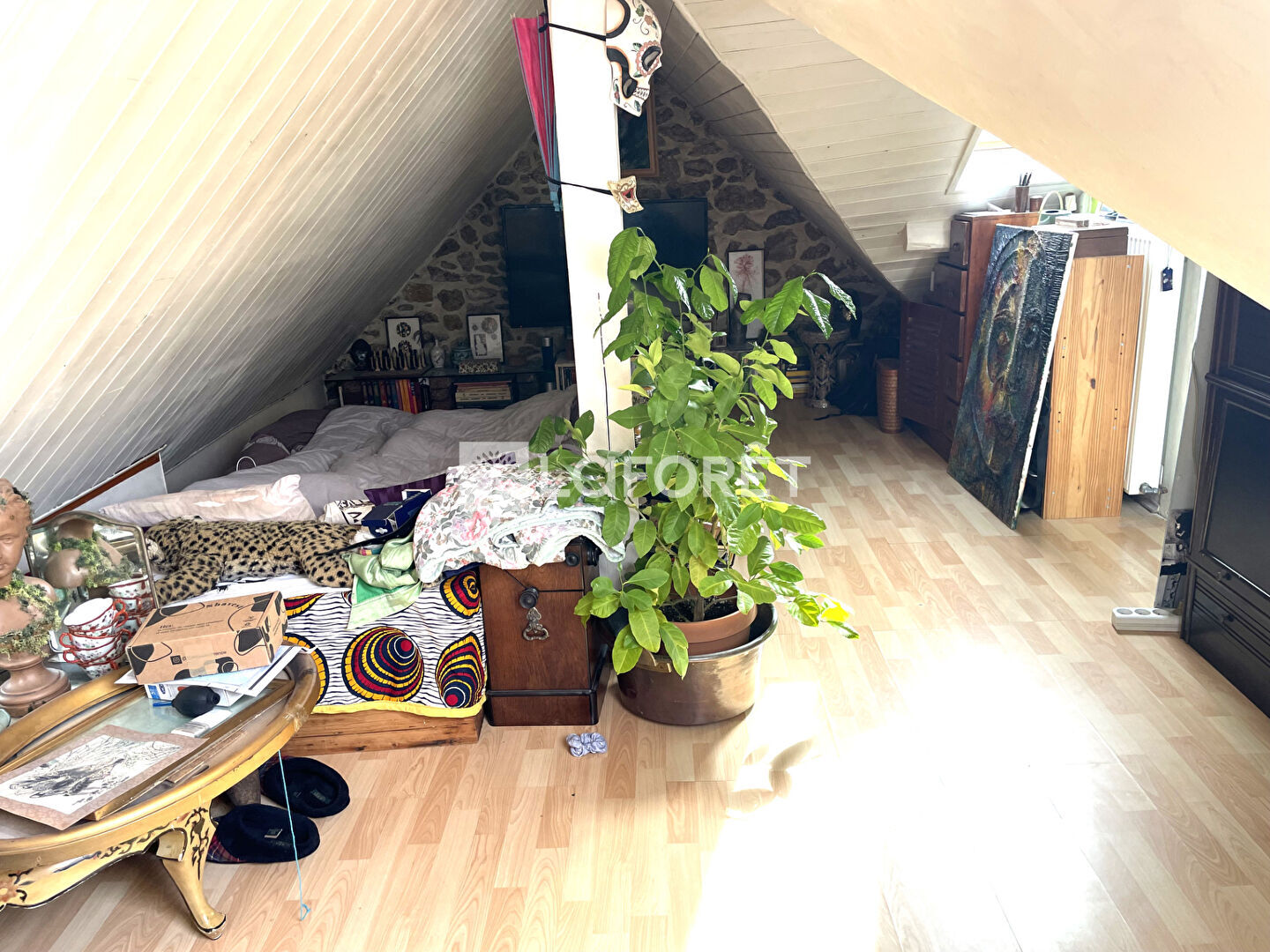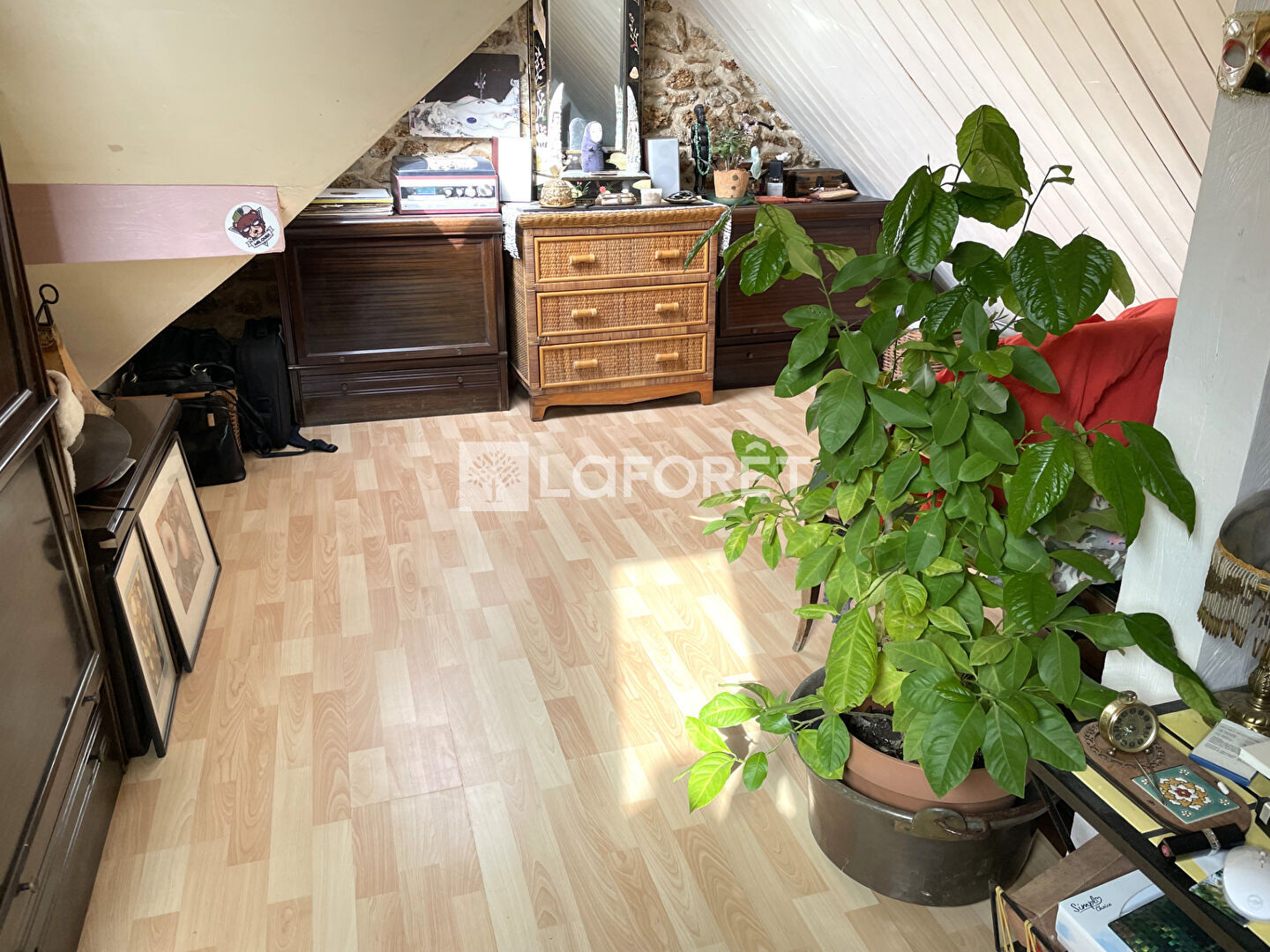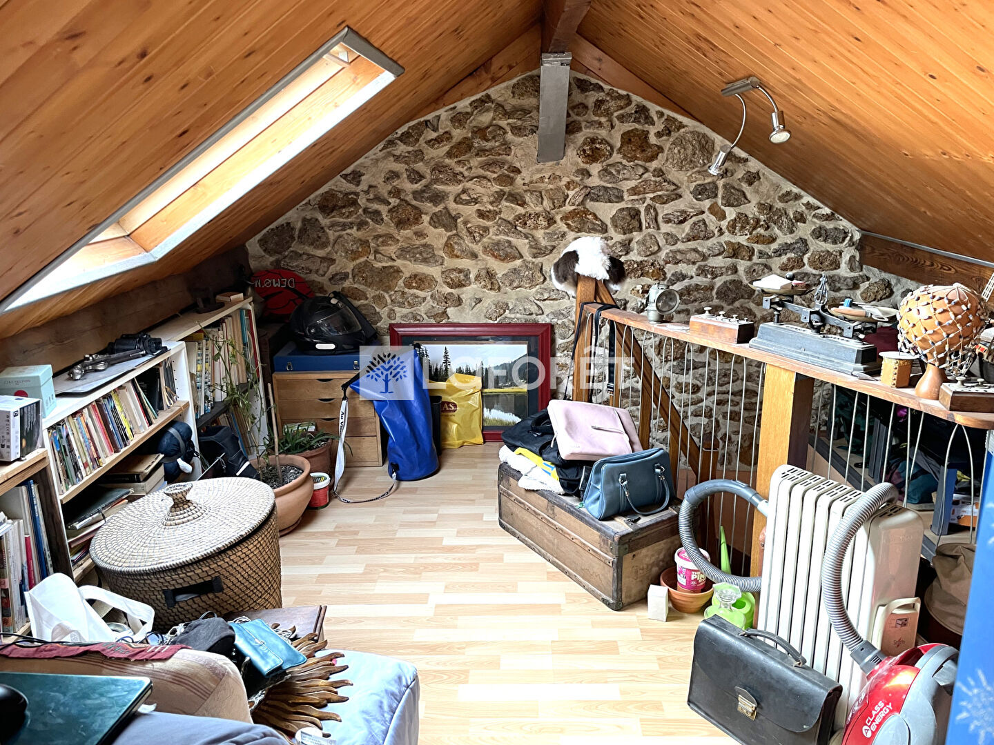 Au grenier : une grande pièce, un bureau avec des rangements.