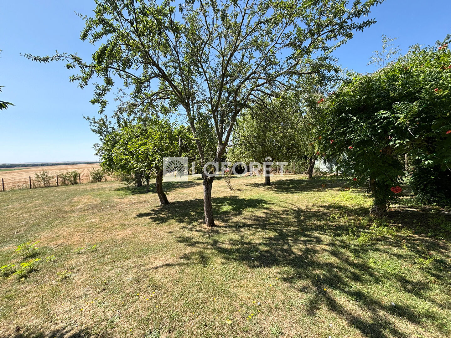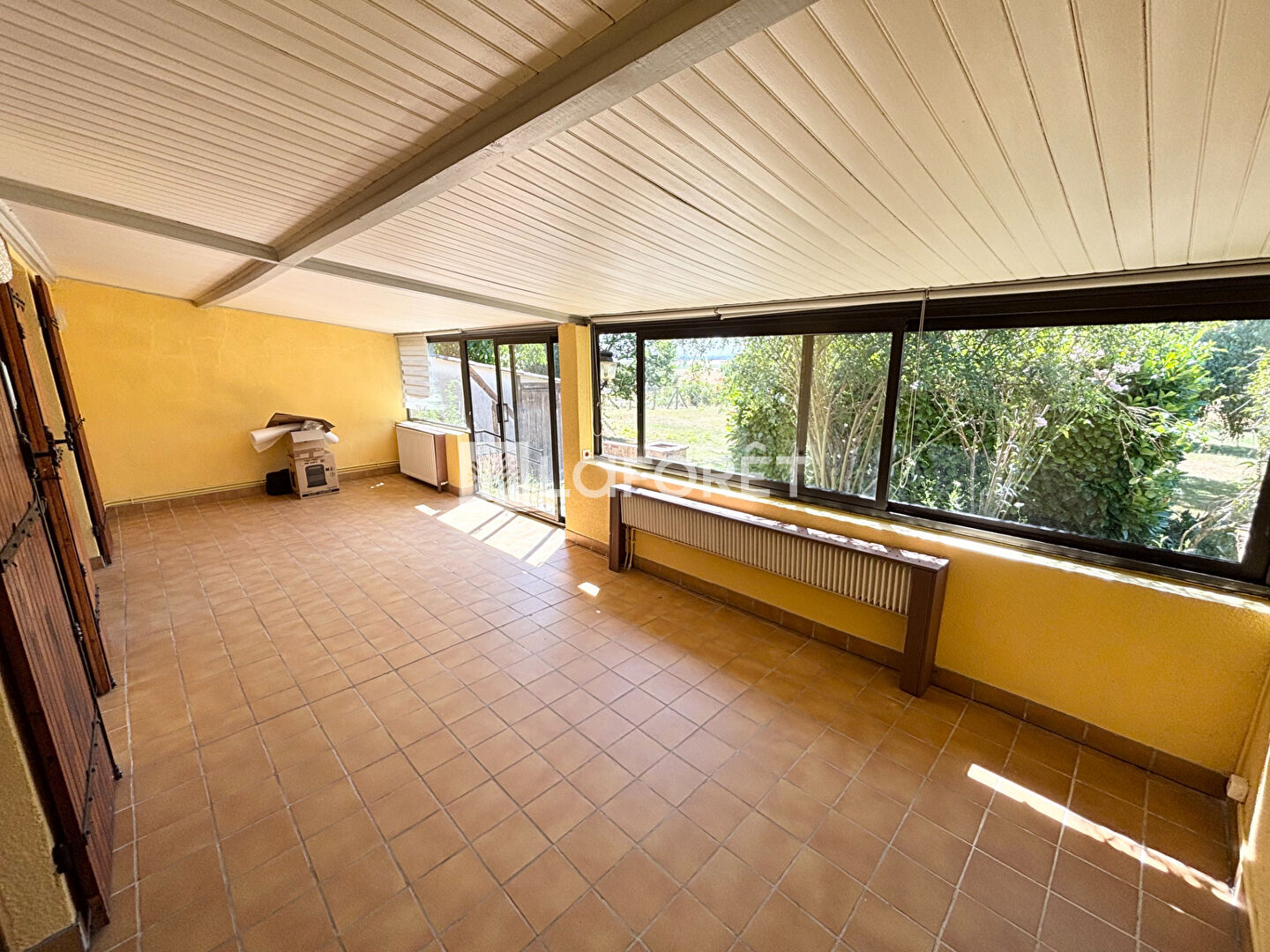 Cuisine ouverte sur salon avec cheminée, une chambre, salle d'eau, WC séparé, véranda lumineuse avec vue sur le jardin.