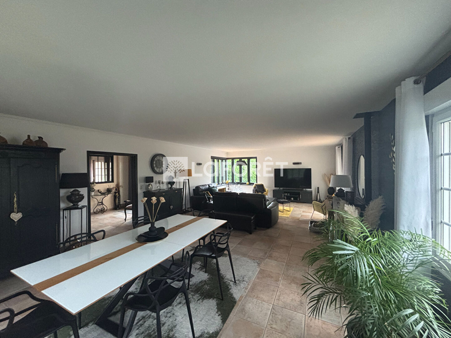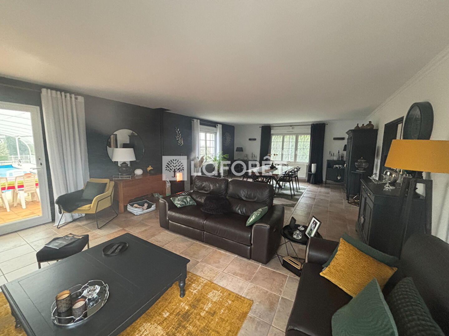 Un vaste salon/séjour de 70 m², lumineux, offrant un accès direct à une piscine couverte et chauffée.