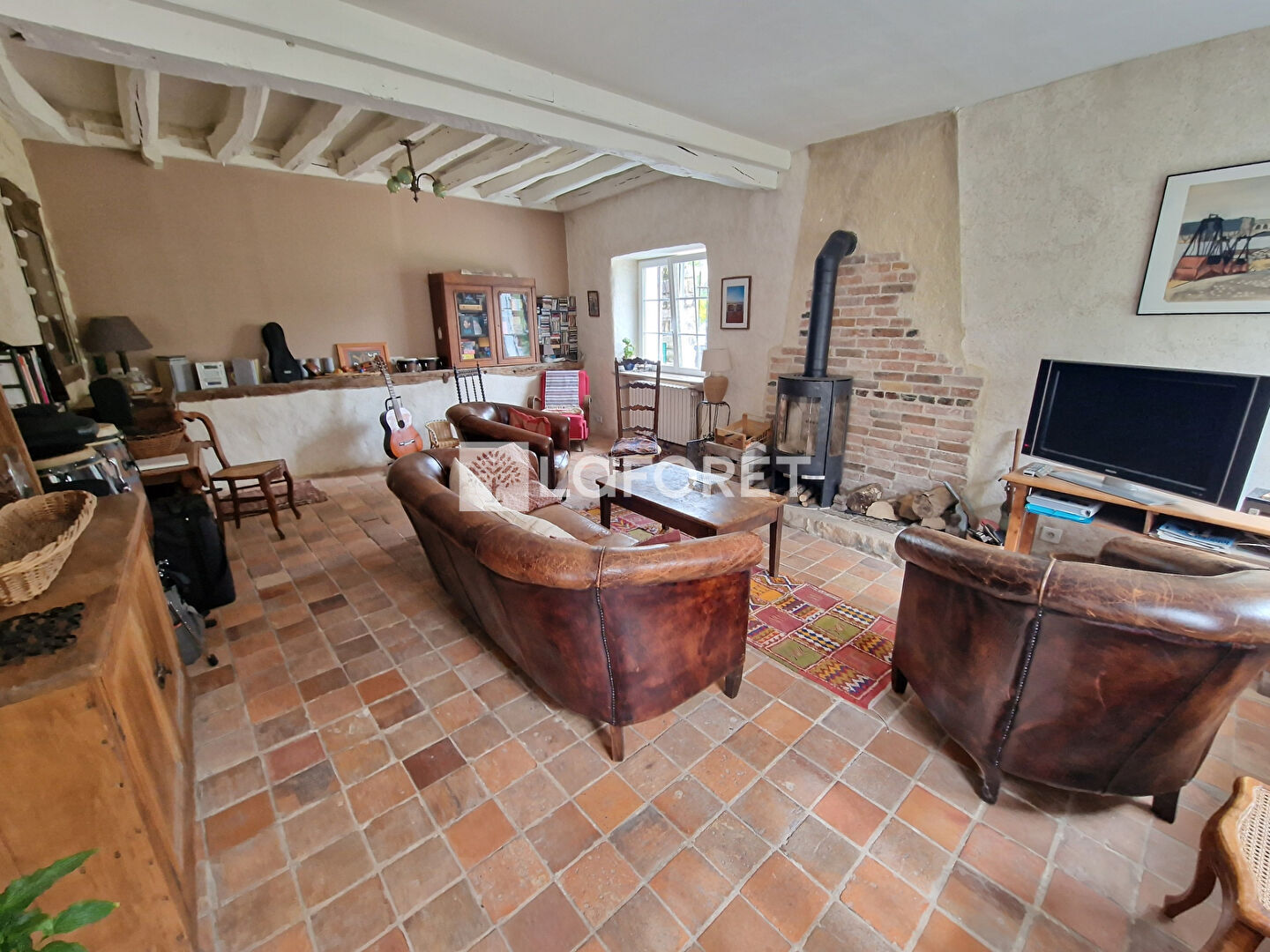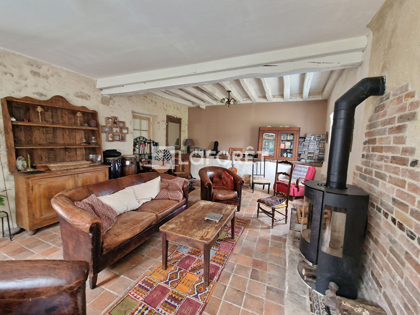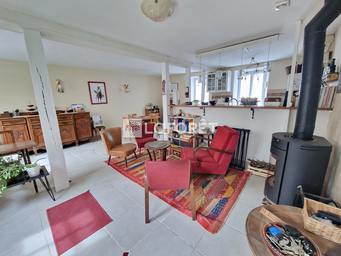 Une première bâtisse de 174m² habitables, entièrement rénovée avec gout et soin, disposant en RDC : d'une entrée, d'un grand salon avec poêle à bois, d'une buanderie, d'un WC, d'un bureau et d'un vaste séjour avec cuisine ouverte aménagée et équipée.