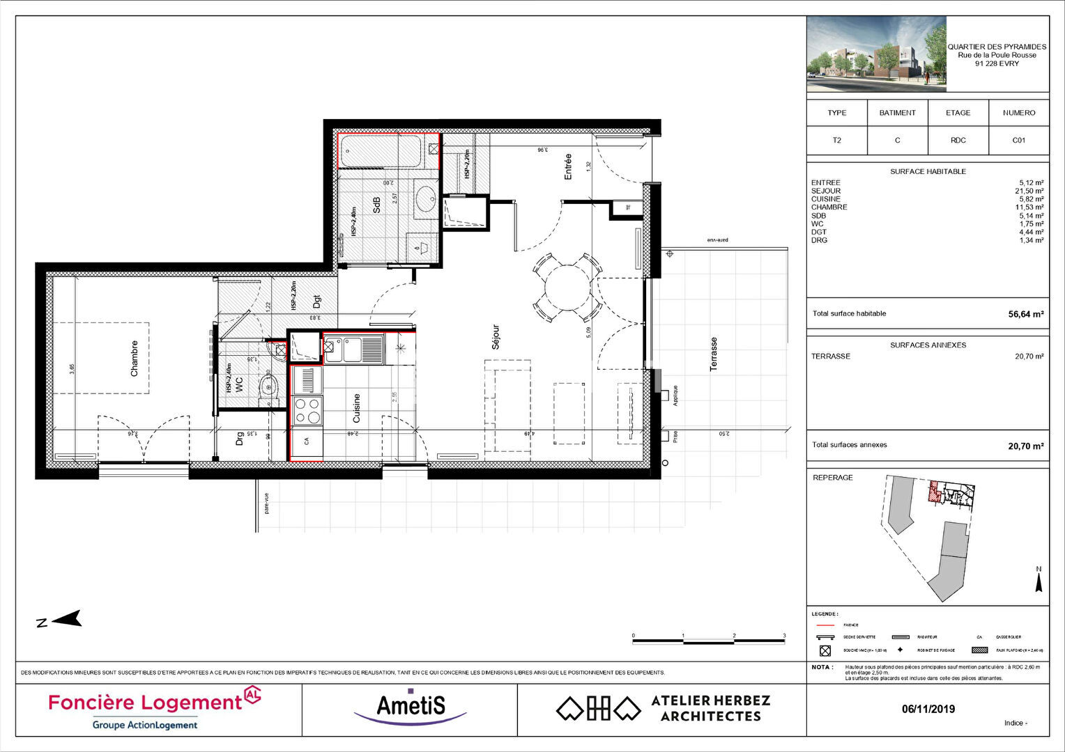 Il est composée d'une entrée, une cuisine nue, un séjour donnant accès à une terrasse de 20.70 m², une chambre, une salle de bain et un WC.