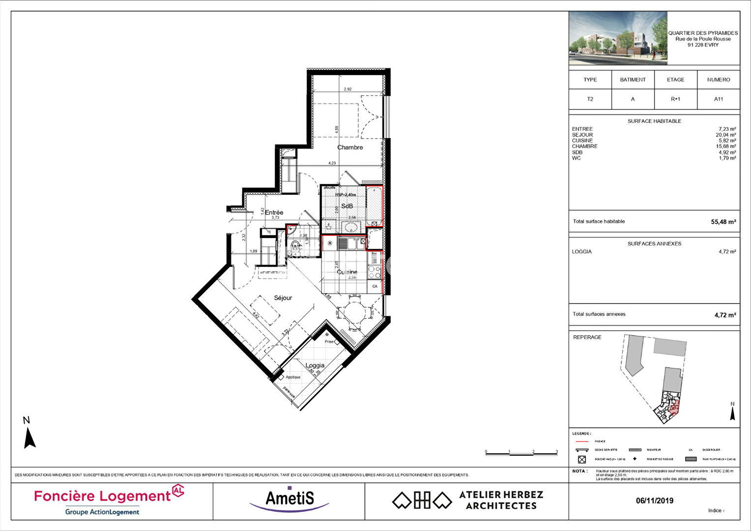 Il est composée d'une entrée, une cuisine nue, un séjour, une loggia de 4.72 m², une chambre, une salle de bain et un WC.