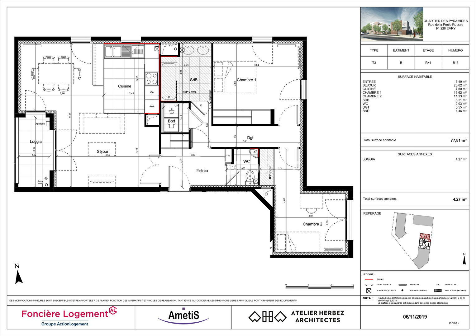 Il est composée d'une entrée, une cuisine nue, un séjour, une loggia de 4.27 m², deux chambres, une salle de bain et un WC.