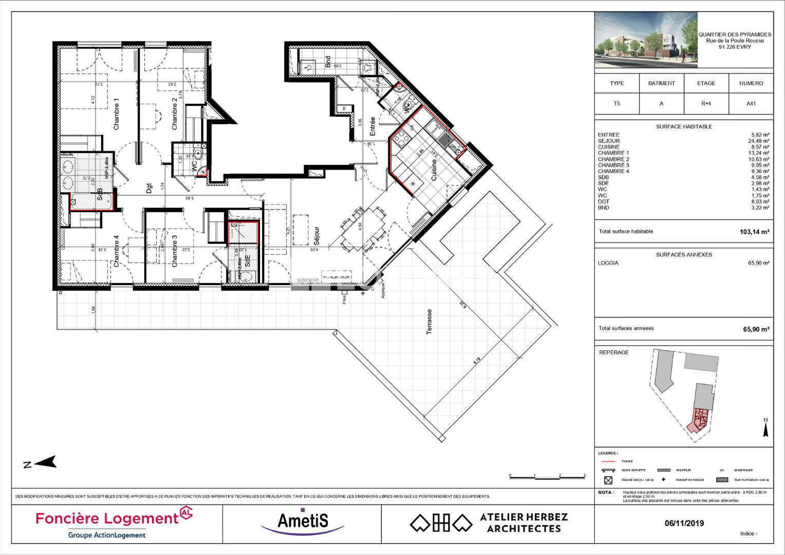 Il est composée d'une entrée, une cuisine nue, un séjour, une loggia de 65.90 m², quatre chambres, une salle de bain, une salle d'eau et deux WC.