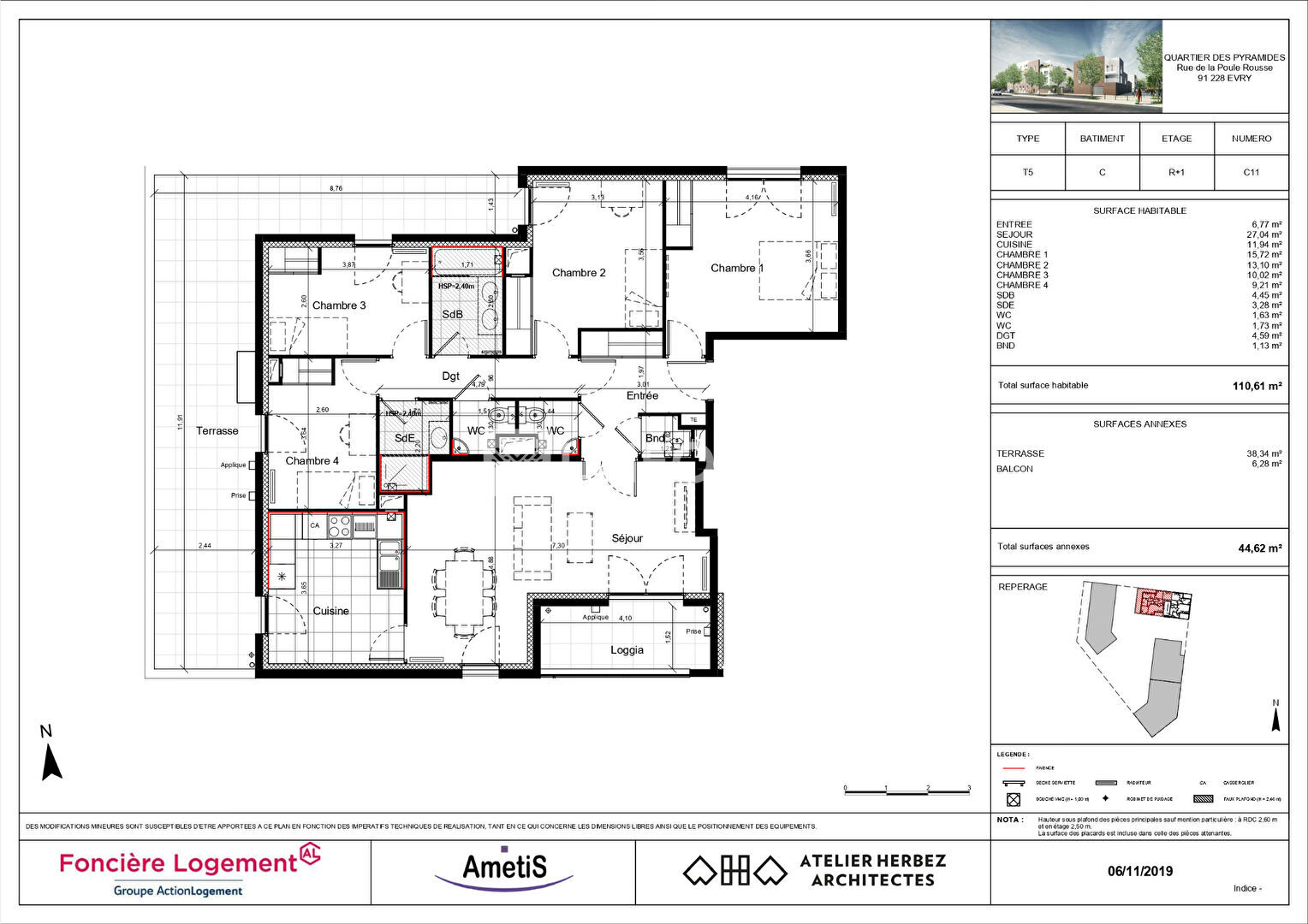 Il est composée d'une entrée, une cuisine nue, un séjour, une terrasse de 38 m², un balcon de 6.28 m², quatre chambres, une salle de bain, une salle d'eau et deux WC.