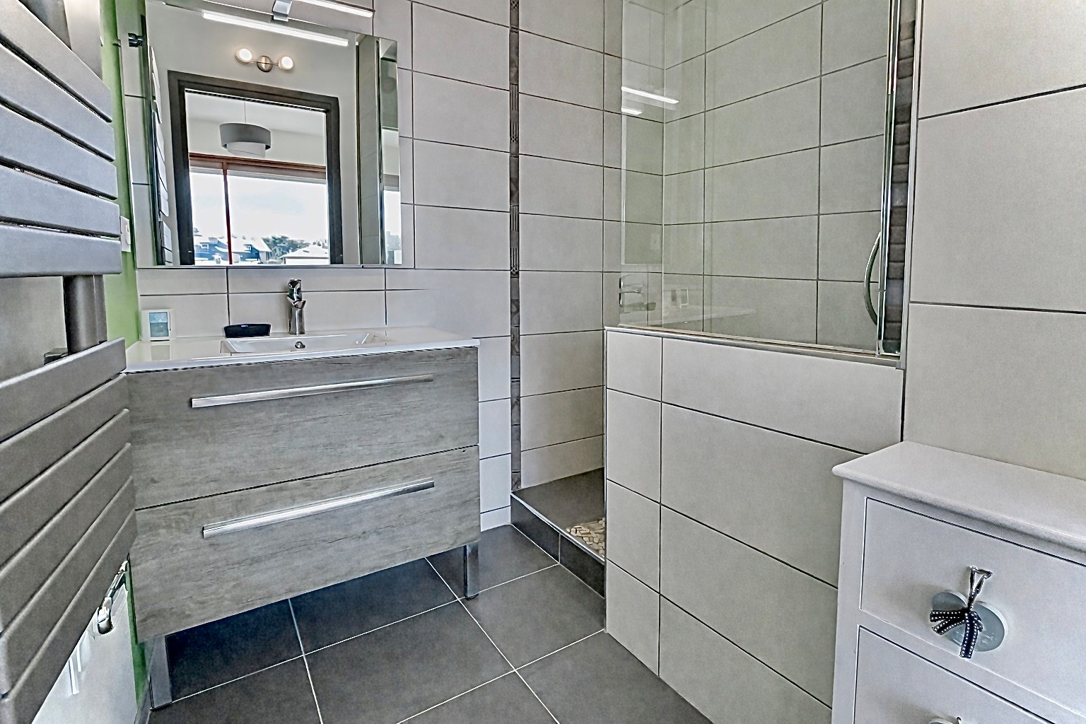 Salle de bain moderne rénovée avec douche, meuble vasque et rangements.
