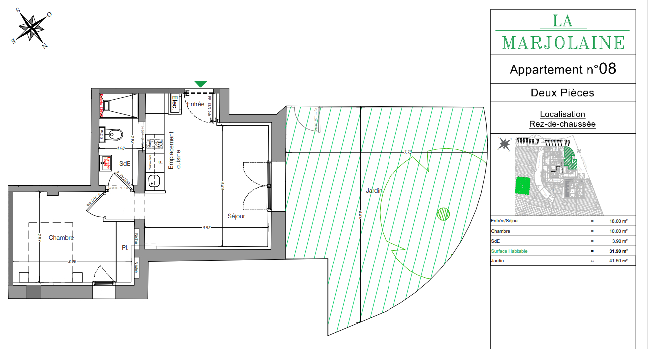 Appartement de 2 pièces, rez de jardin comprenant : séjour/cuisine, chambre, salle d'eau et jardin 41.50m²