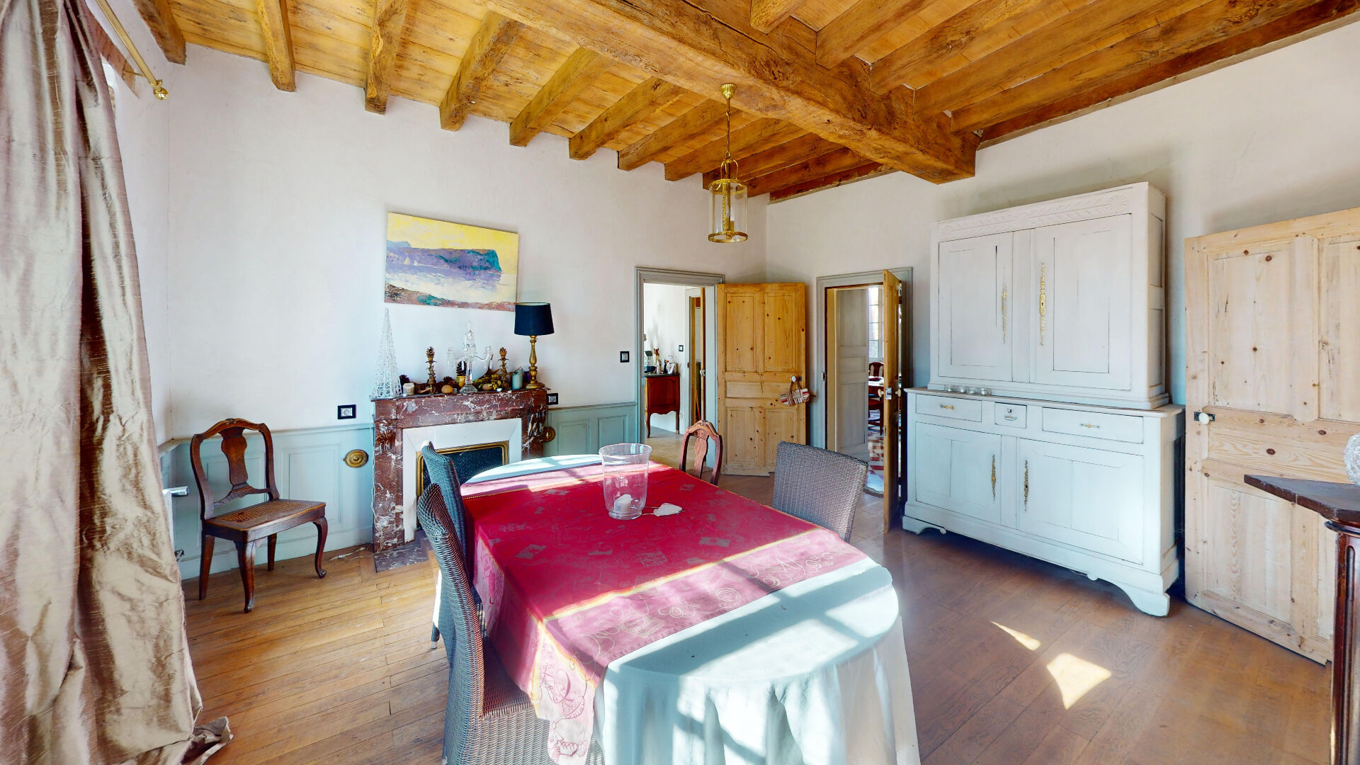 Au rez-de-chaussée : une vaste entrée, une salle à manger, un salon, une cuisine, une chambre, une salle de bains et un cellier.