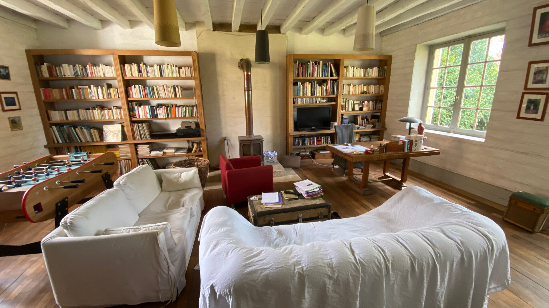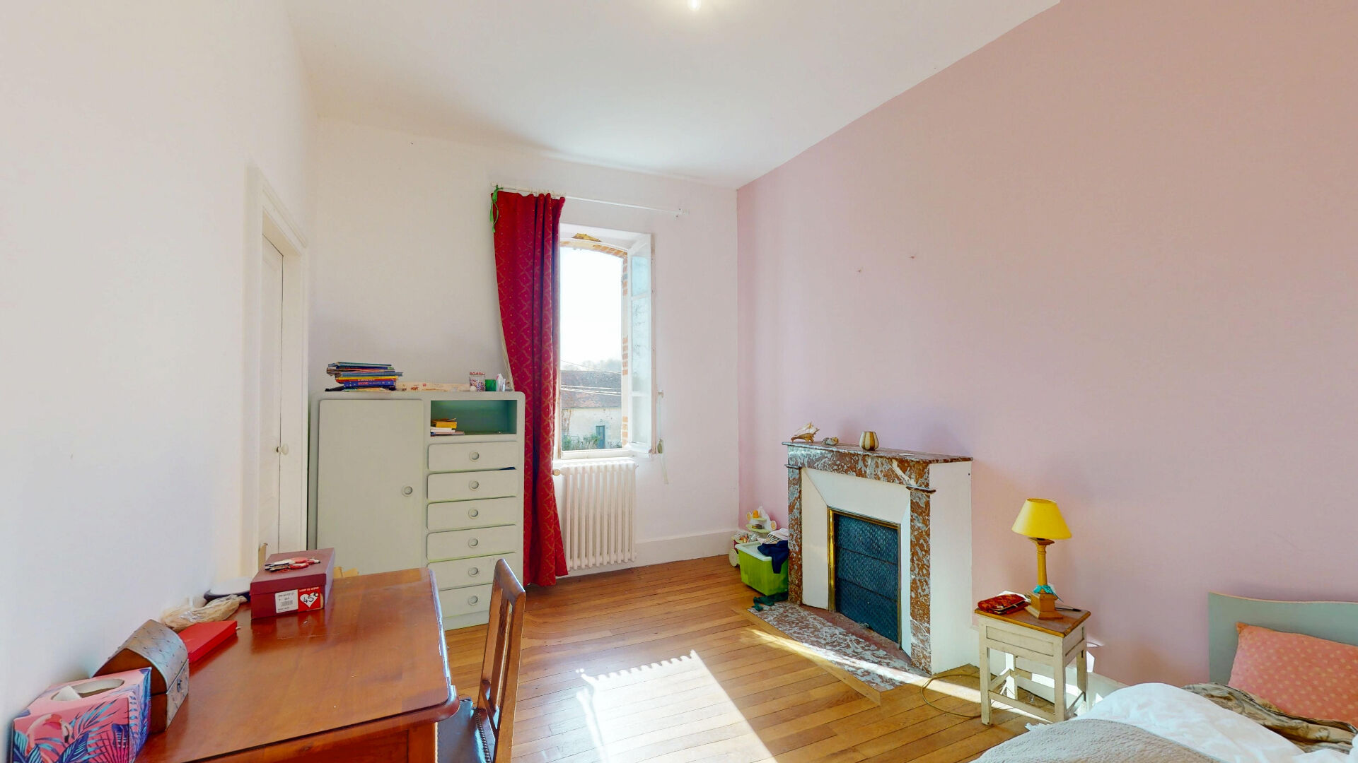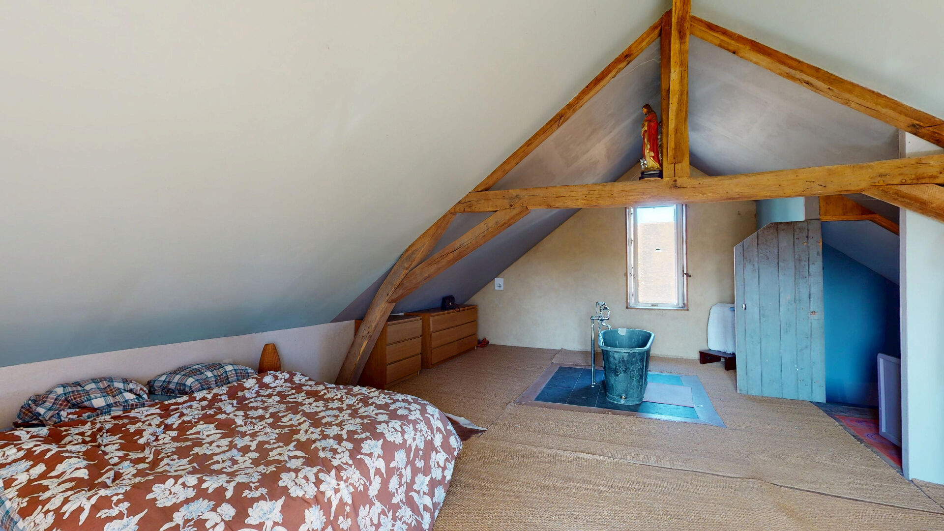 Au deuxième étage : une grande chambre avec baignoire.