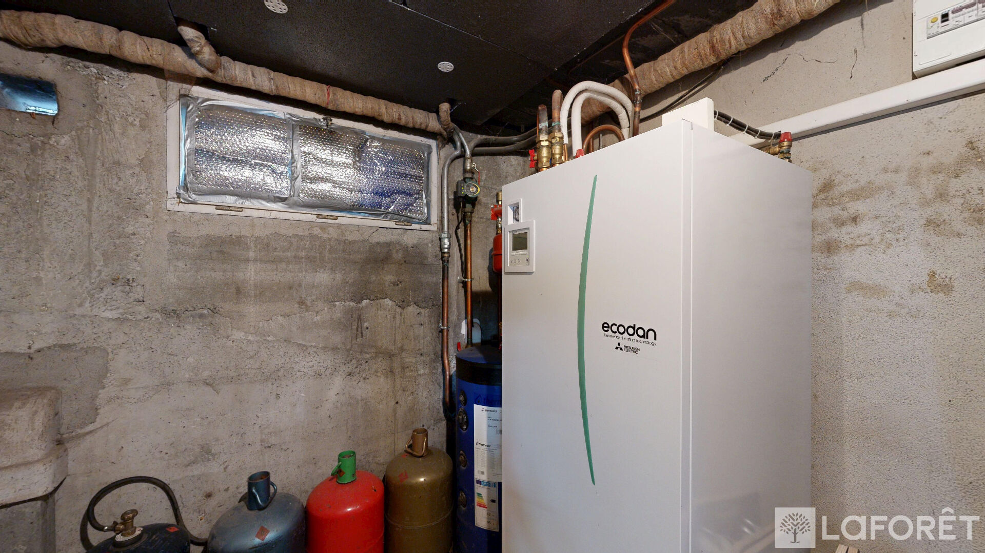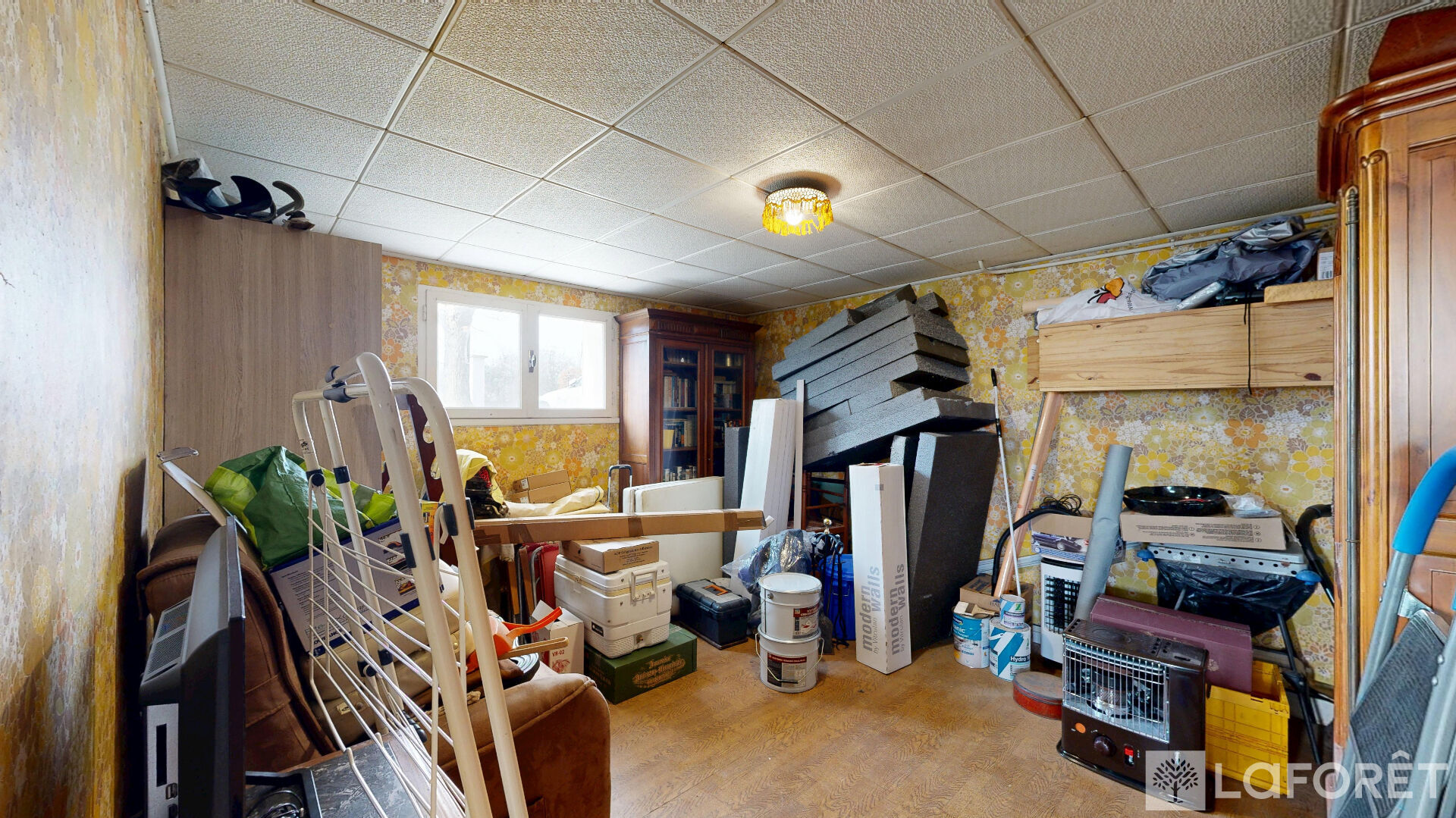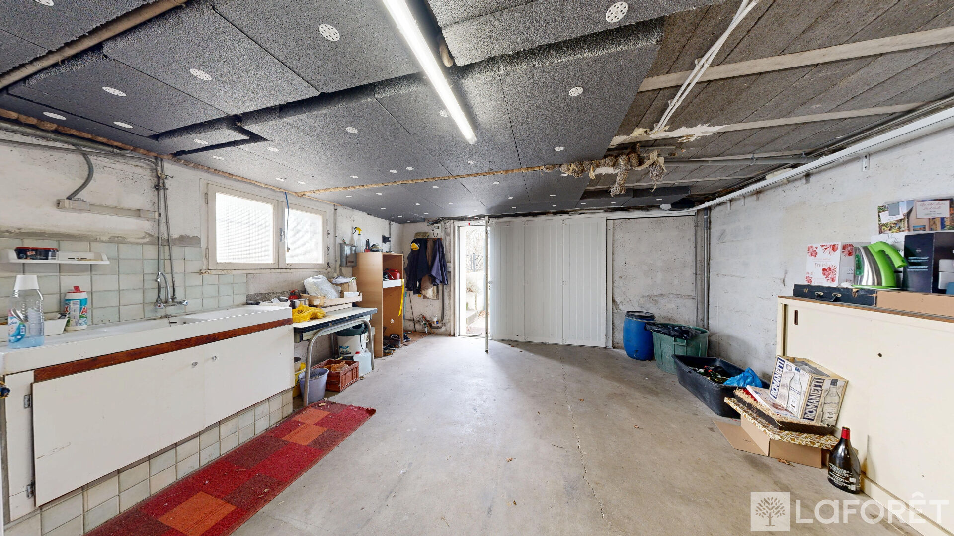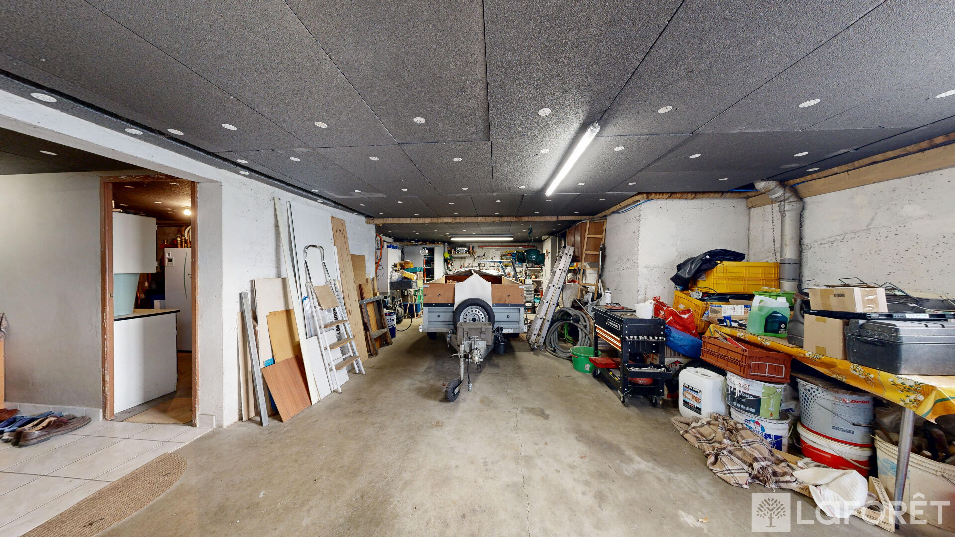 Sous-sol complet avec garage 2 voitures, chaufferie, chambre d'appoint et cave.