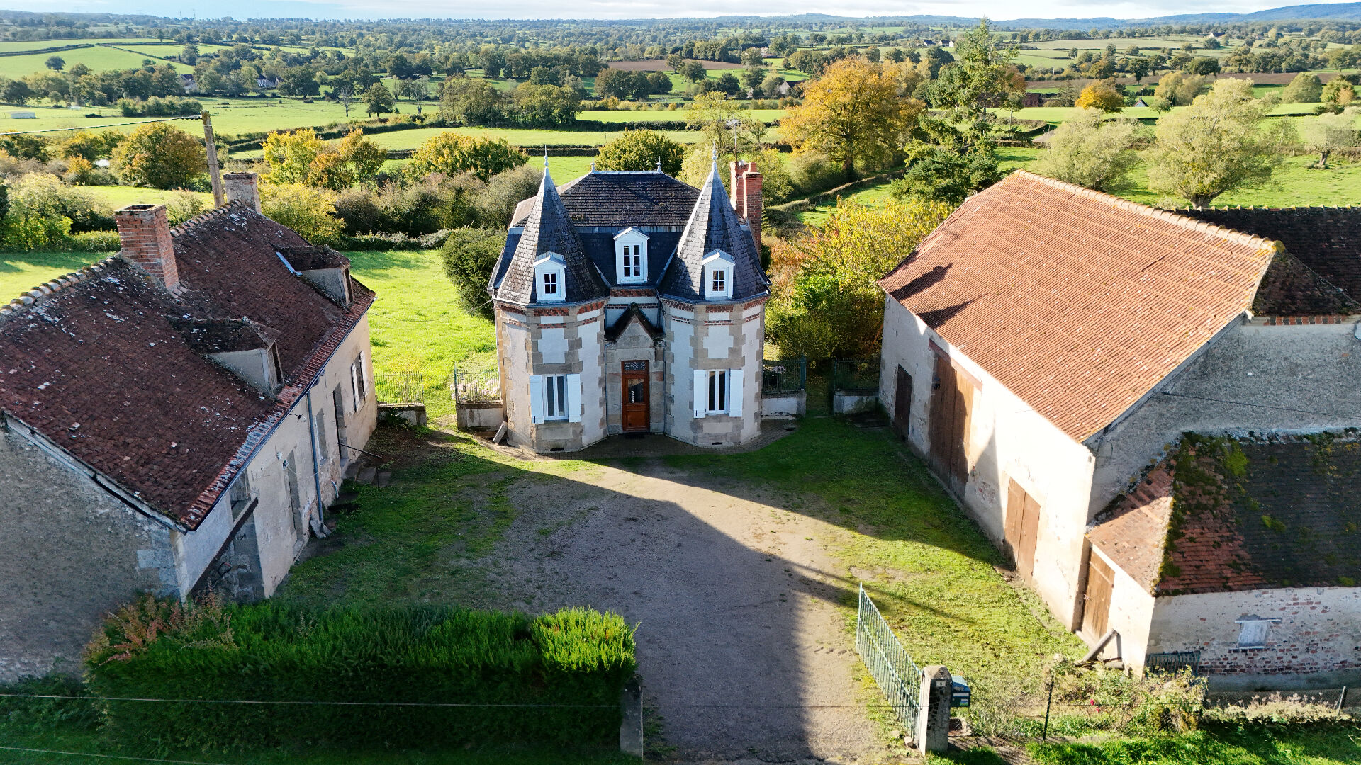 La maison principale de style castel dispose d'une cuisine aménagée et équipée ouverte sur une salle à manger conviviale, un salon chaleureux, une salle de bains et trois chambres à l'étage. Chauffage central et fenêtres double vitrage récentes assurent confort et modernité.