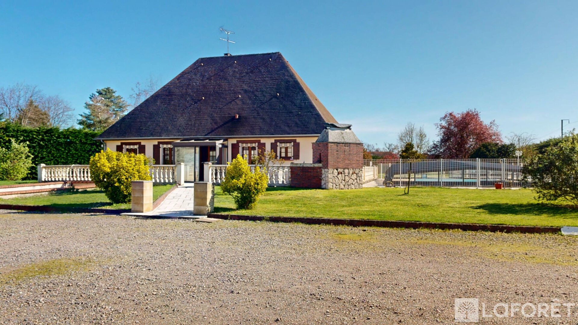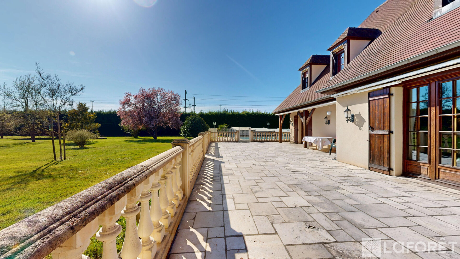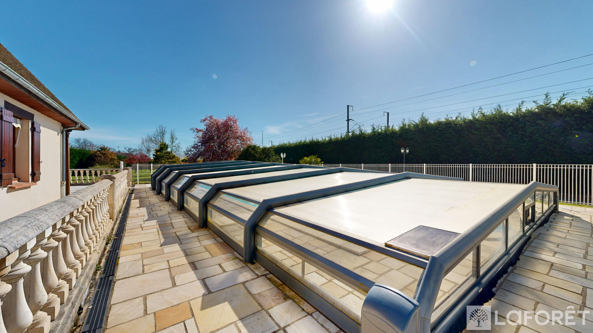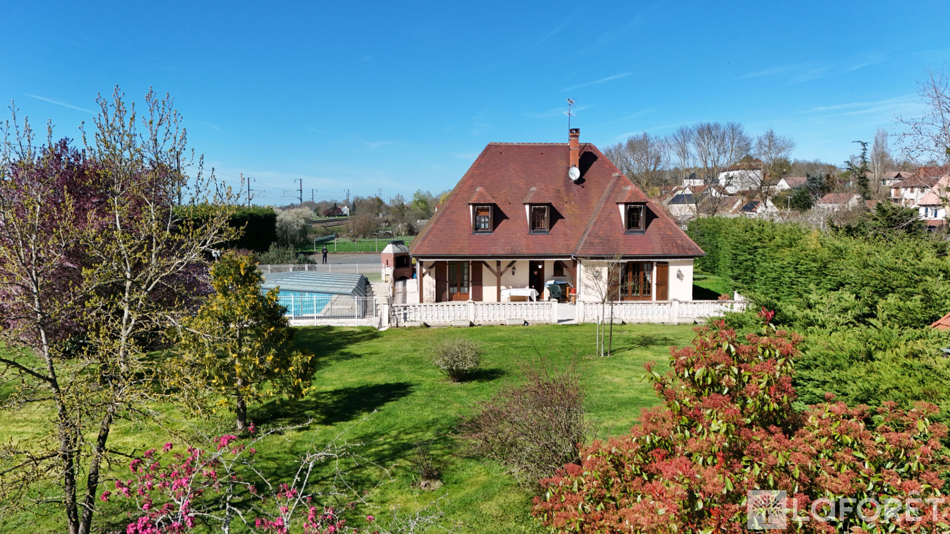 À l'extérieur : dépendance d'environ 300 m² au sol + mezzanine, cour permettant le stationnement de plusieurs véhicules, piscine couverte 12 x 6, terrasses, parc arboré et puits.