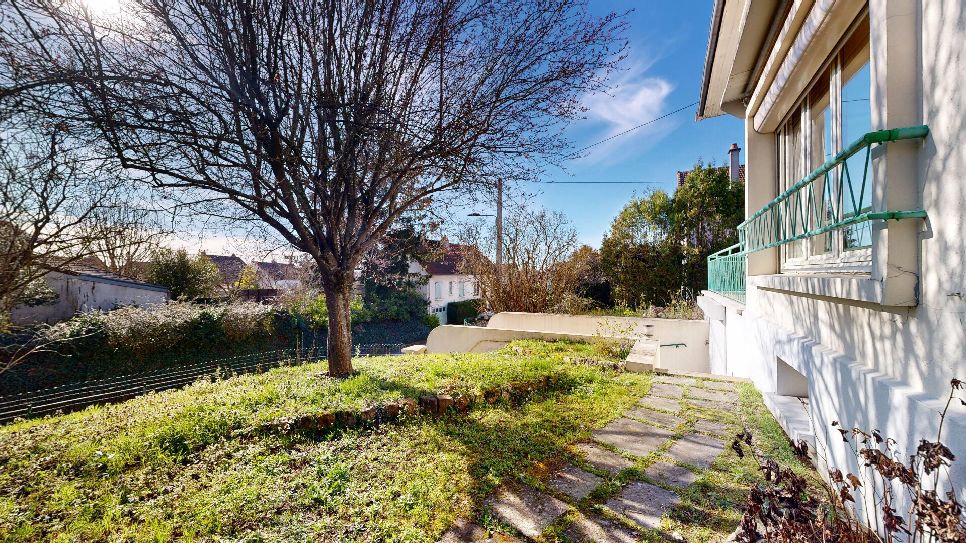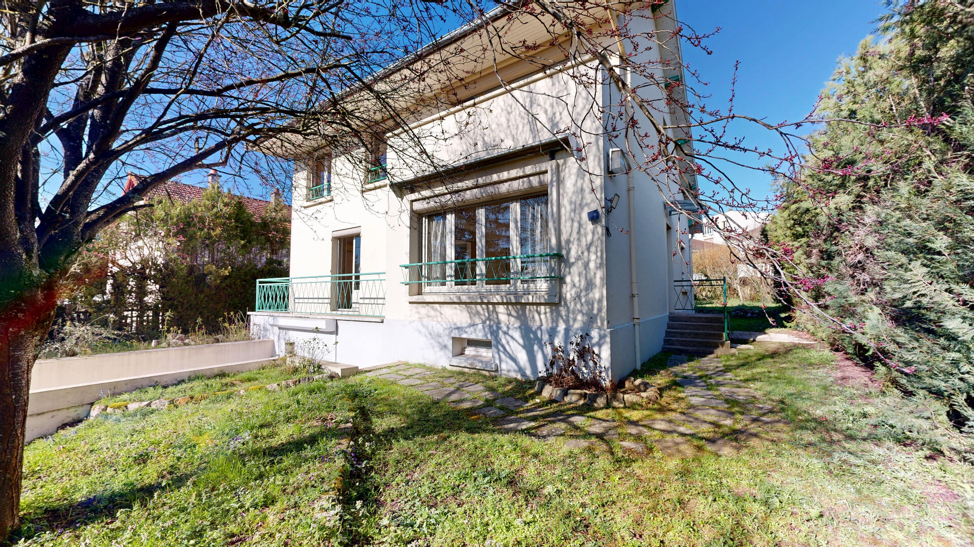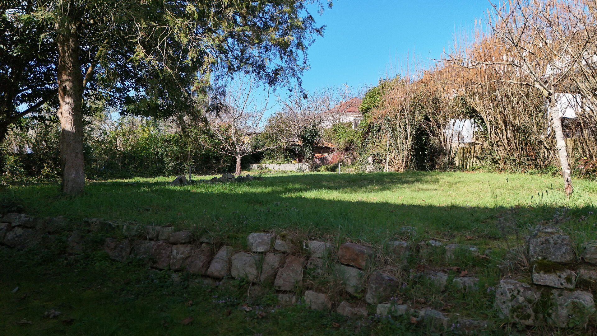 Joli jardin clos et arboré, environ 100 m2 de sous-sol avec garage.