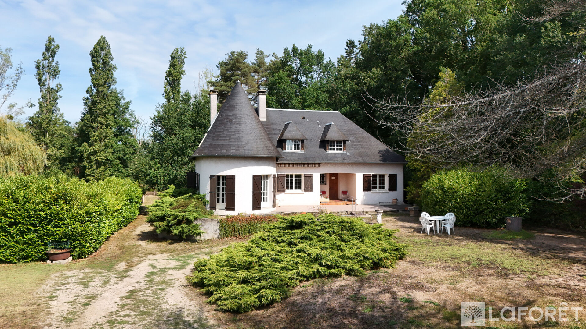 À l'extérieur, une allée gravillonnée mène à un jardin verdoyant composé de grands arbres et d'un petit étang.