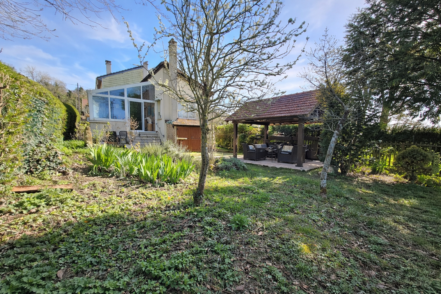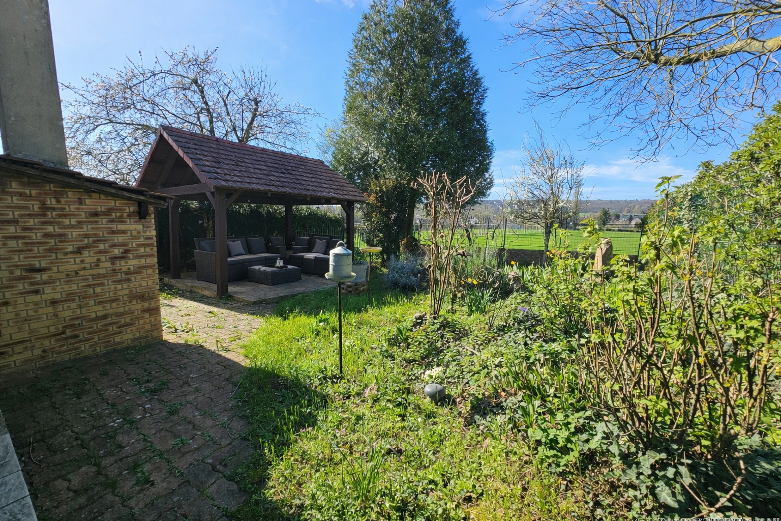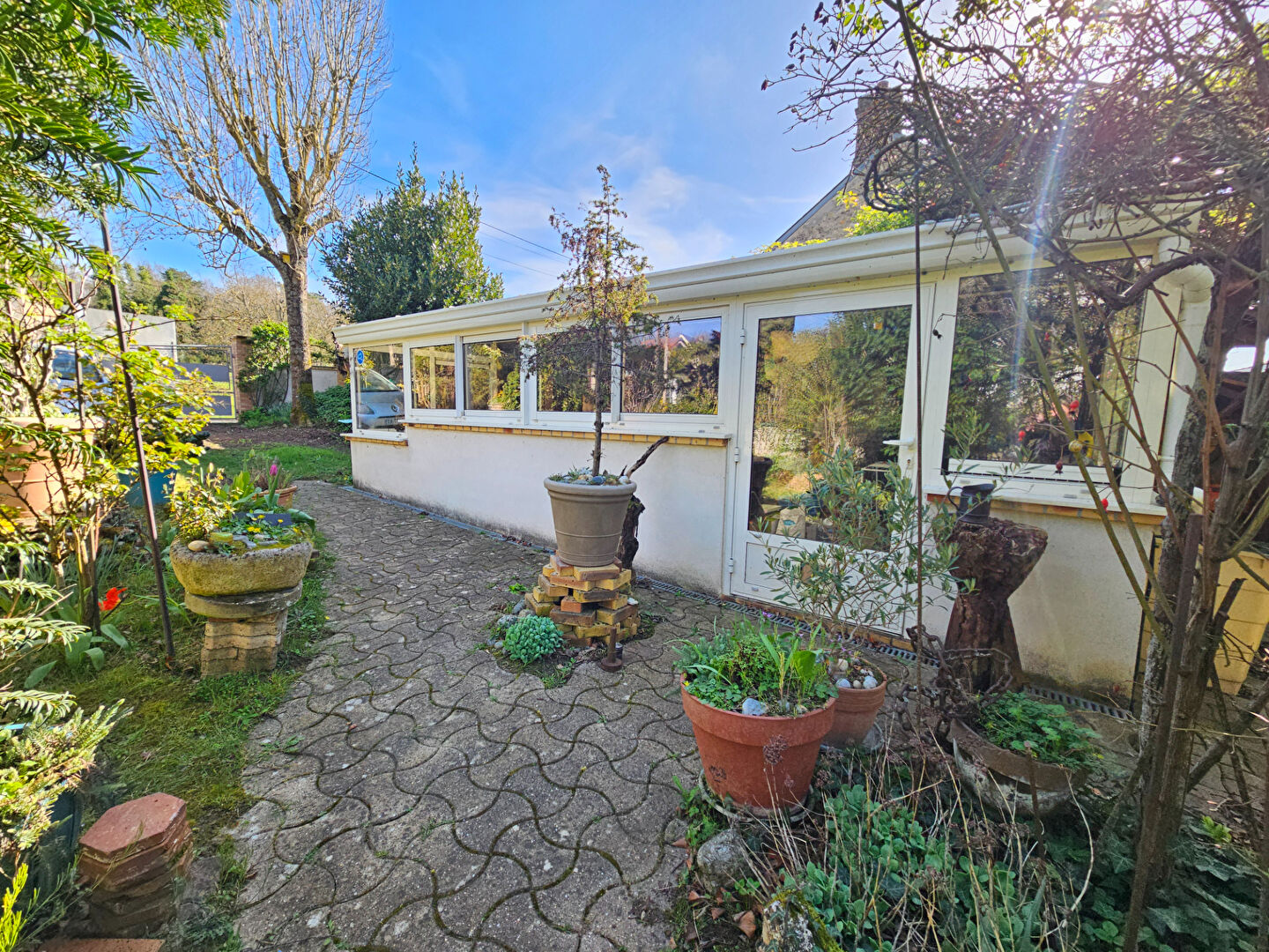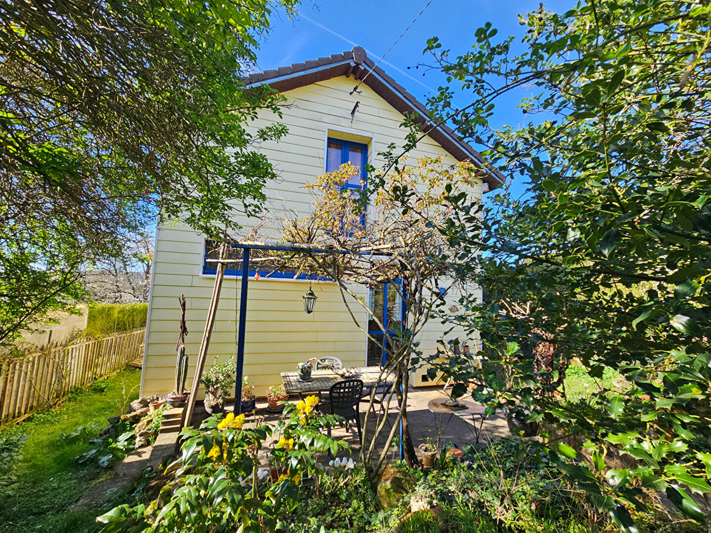 Pour compléter cette maison un jardin clos et arborée avec préau , terrasse, et atelier très lumineux ( idéal pour un bricoleur ou artiste ).